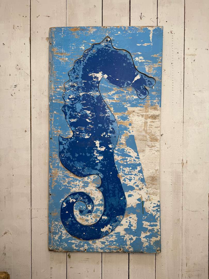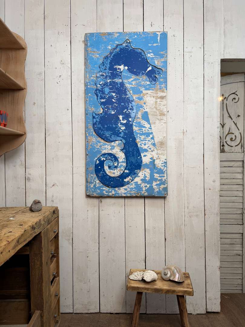 Ancien panneau décoratif représentant un hippocampe, réalisé en puzzle de contreplaqué bois. Belle patine du temps, traces d’usure et de peinture qui lui donnent tout son caractère. Idéal dans une maison de bord de mer ou une ambiance esprit cabane, atelier ou maison de vacances.