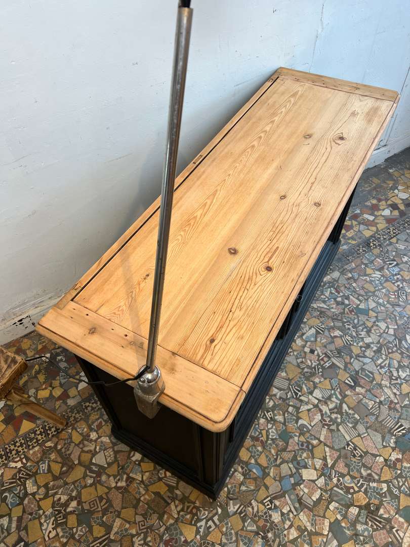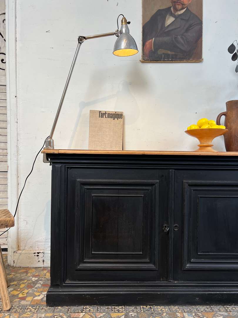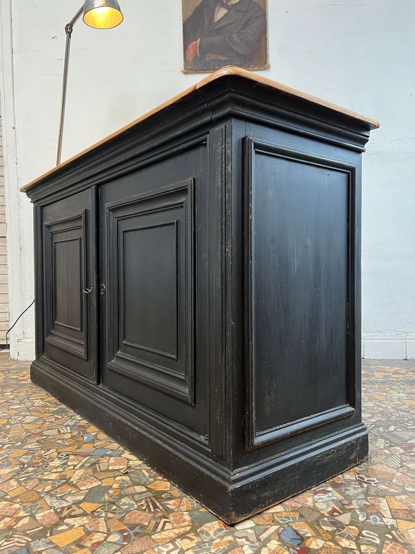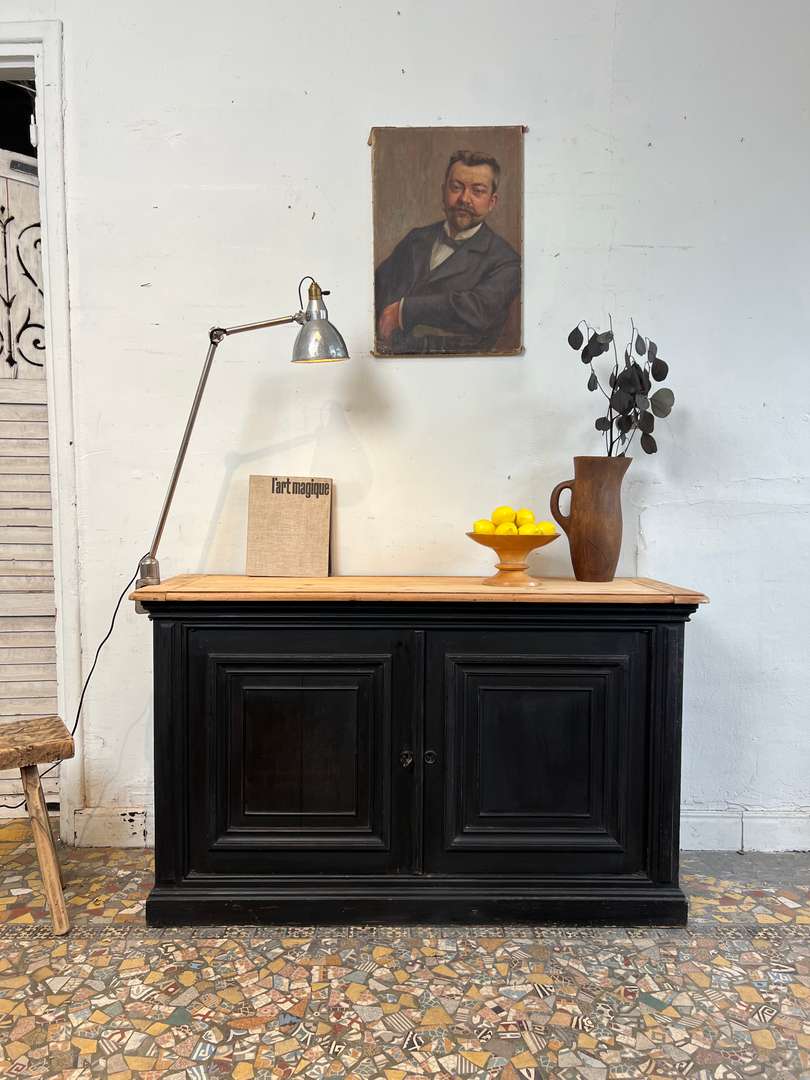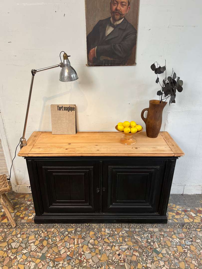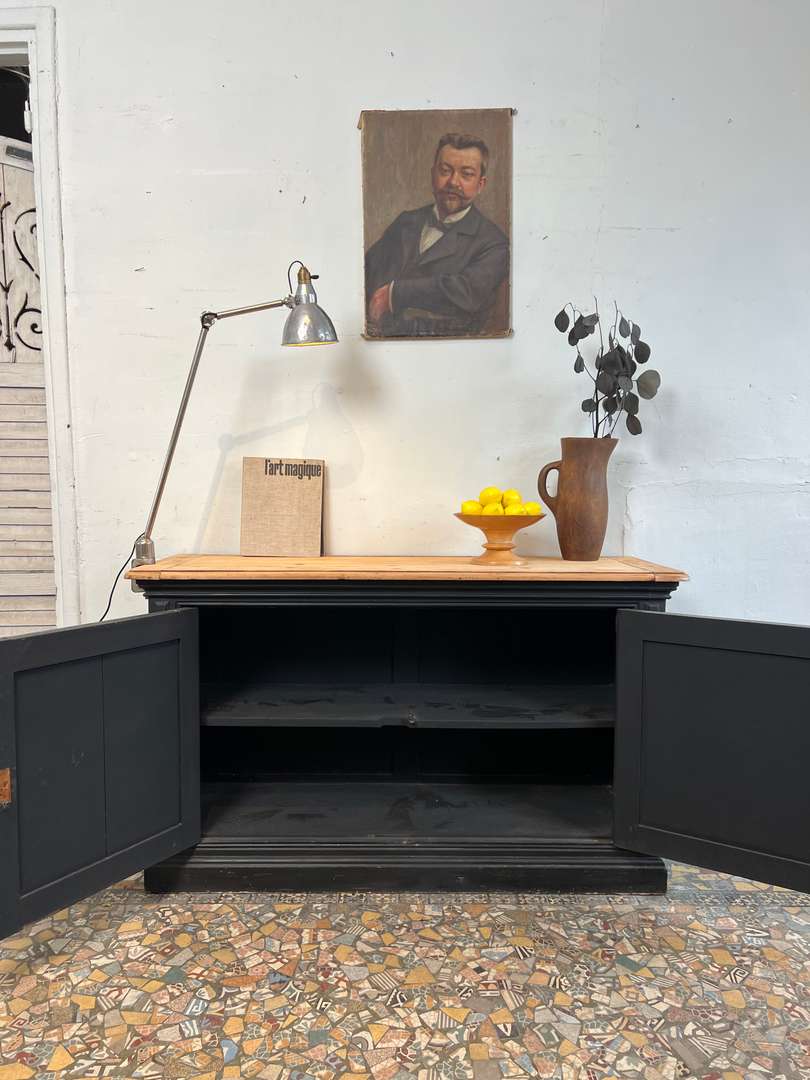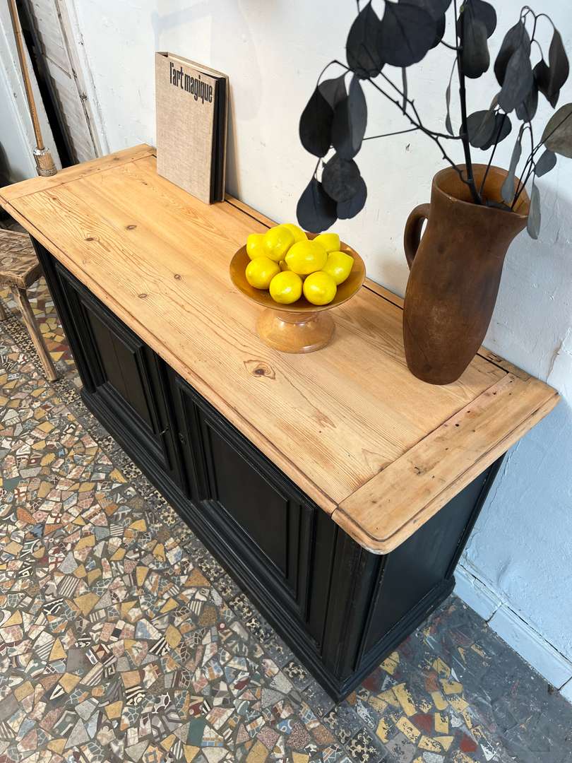 Petit buffet ancien en sapin 450 € Ajouter au panierAncien buffet en sapin, peint en noir, avec un plateau laissé en bois brut. Une pièce simple et pratique, facile à intégrer dans une cuisine, une entrée ou un séjour. L’intérieur offre un bel espace de rangement. #buffetancien #meublevintage #buffetnoir #meublesapin #brocante #decorationinterieur #marchanddoublisDimensionsLargeur133 cmProfondeur45.5 cmHauteur81 cmProfondeur intérieure34 cmRenseignementsRéférence2547008
