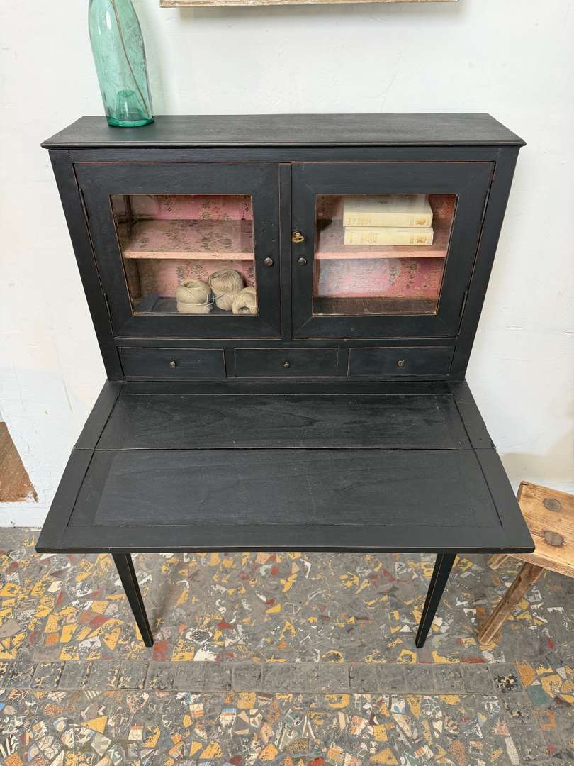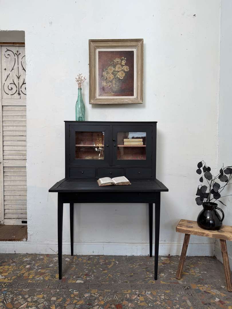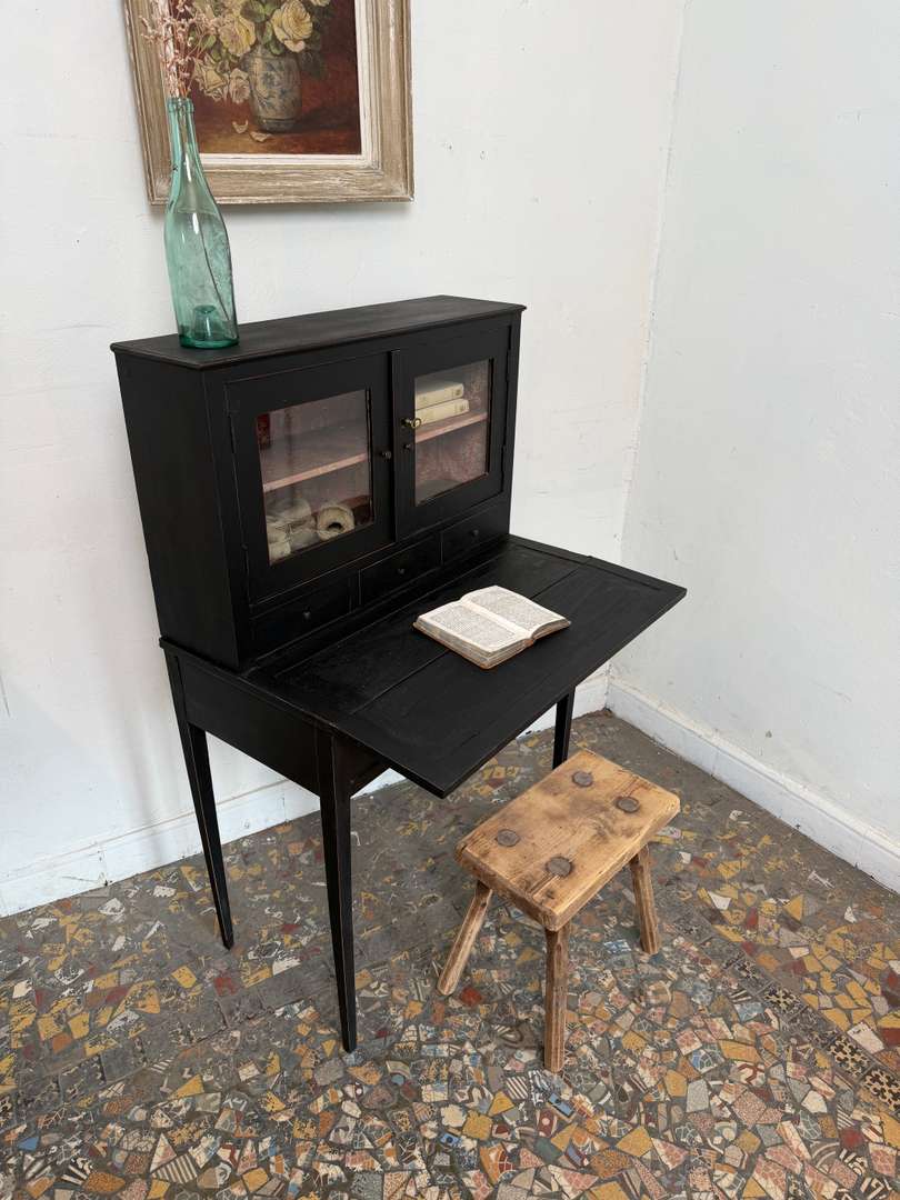 Charmant petit bureau bonheur du jour, peint en noir. La partie écritoire se replie pour former un plateau.