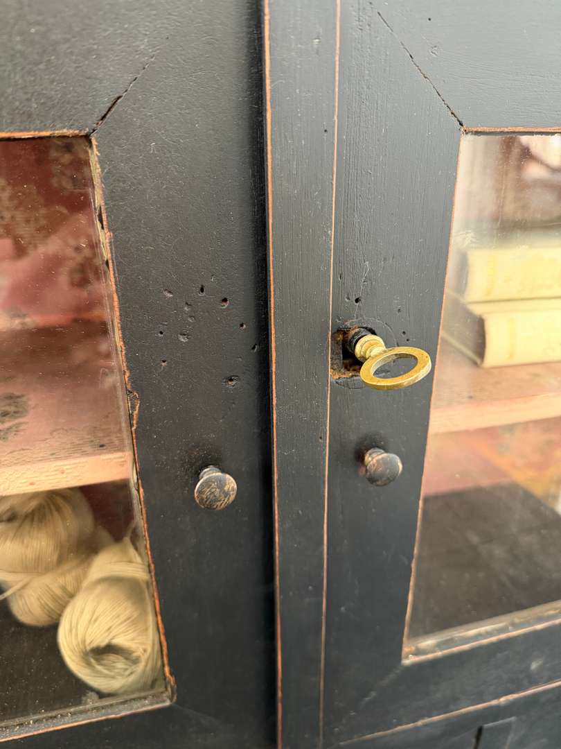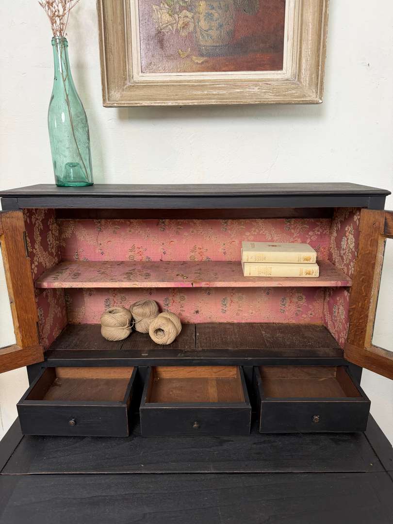 En partie haute, deux portes vitrées (elles ferment, mais pas à clé) laissent apparaître une étagère et trois petits tiroirs. Intérieur conservé avec son tissu d’origine, aux motifs anciens.