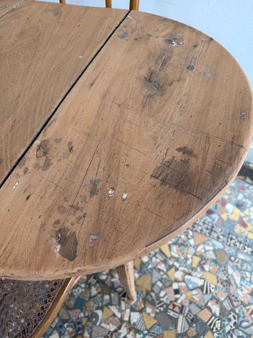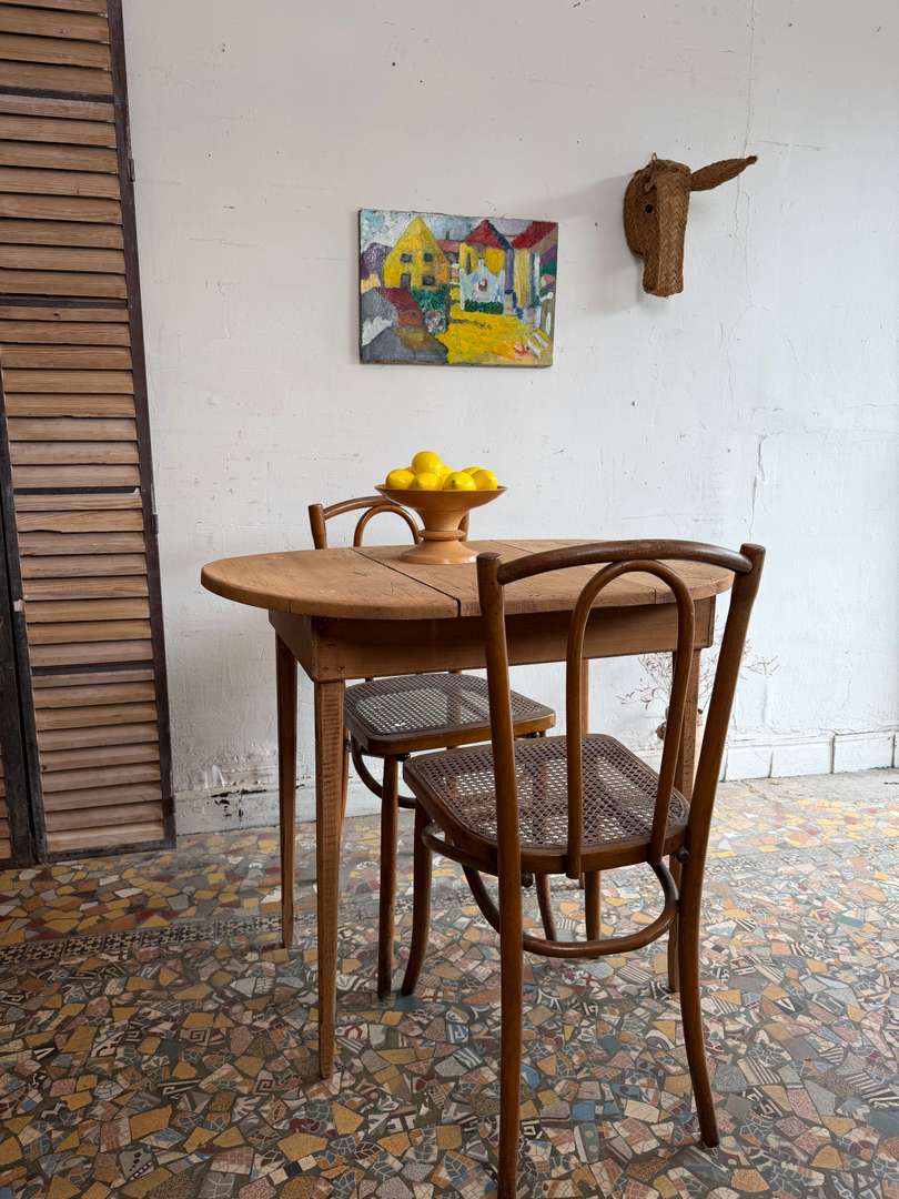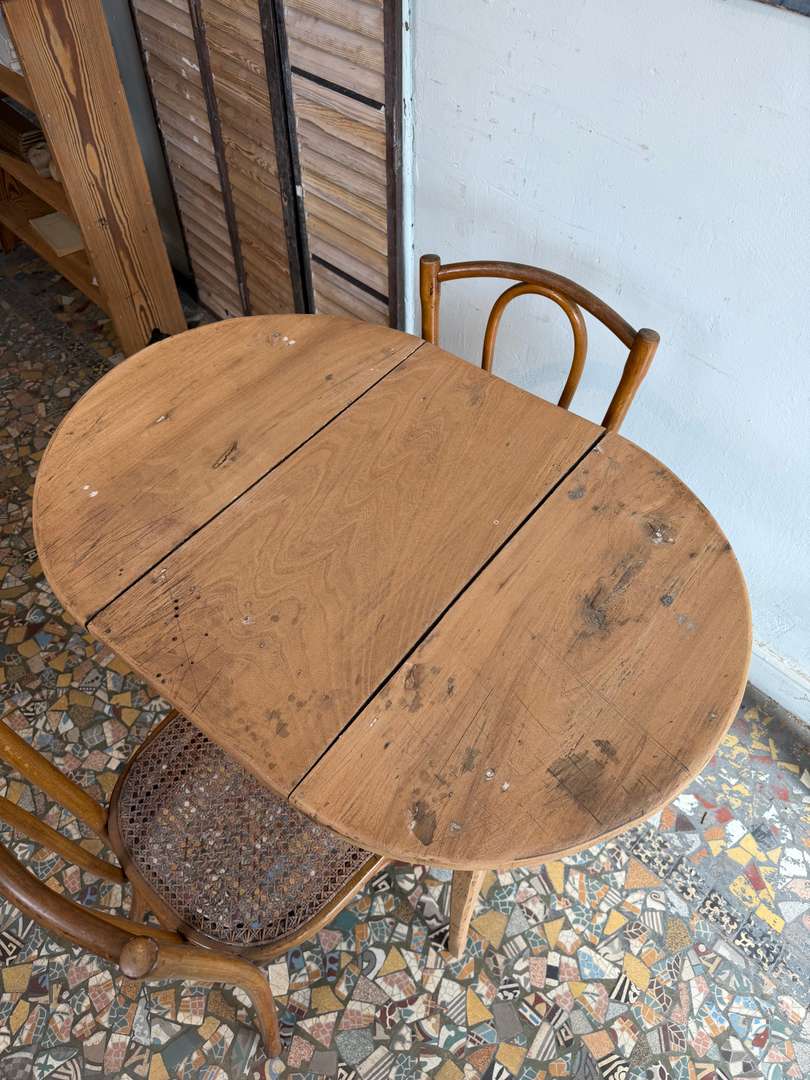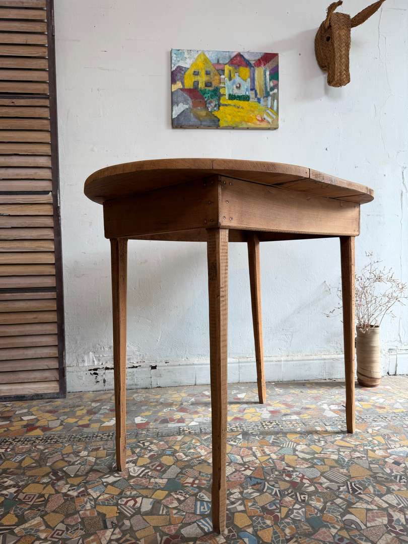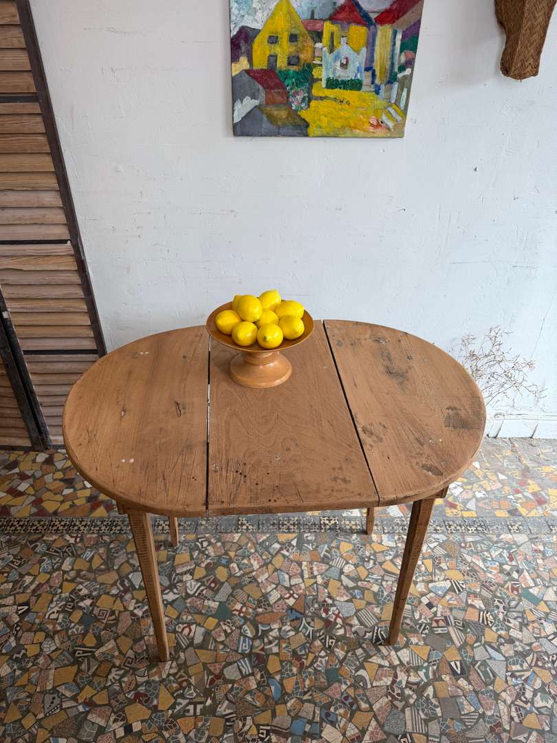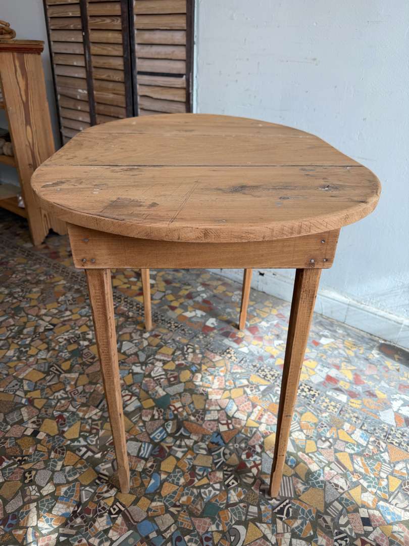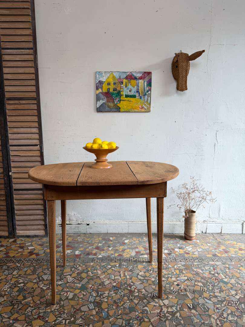 Ancienne table de cuisine ou table d’appoint en merisier, au format compact et facile à placer.