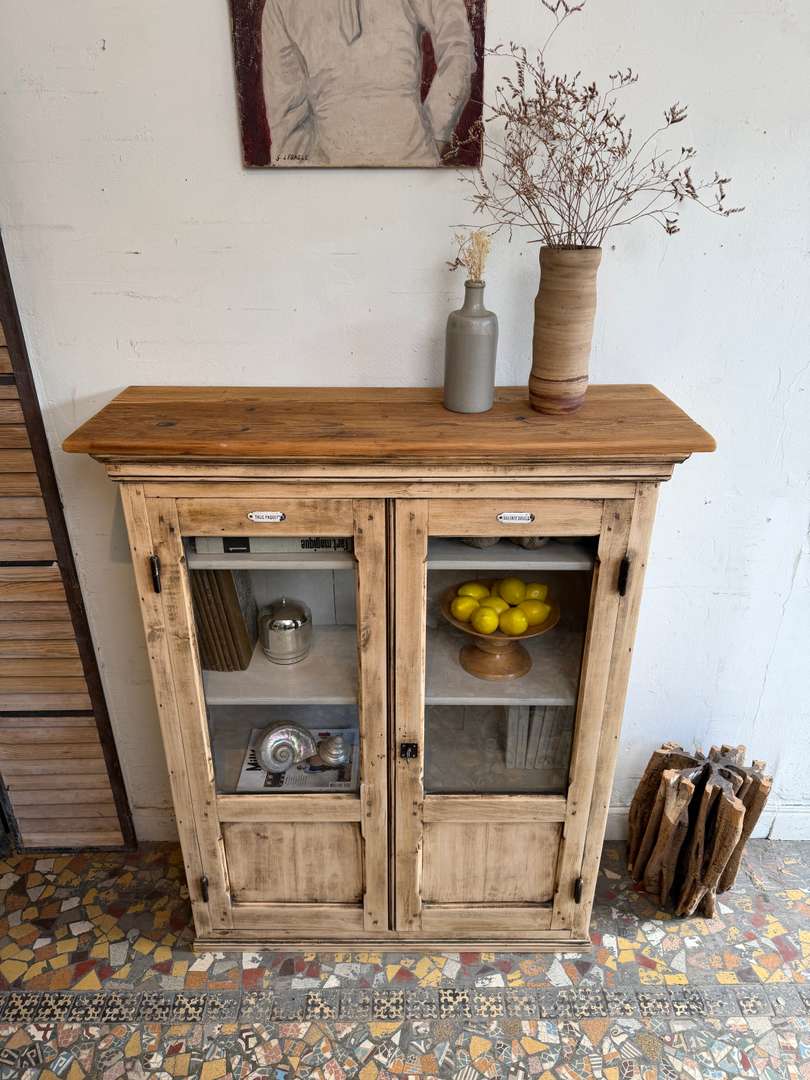 Ancienne vitrine en peuplier, avec plateau en sapin, datant du XIXe siècle. Un format compact qui peut se poser au sol, sur un meuble ou un plan de travail, et même se fixer au mur.