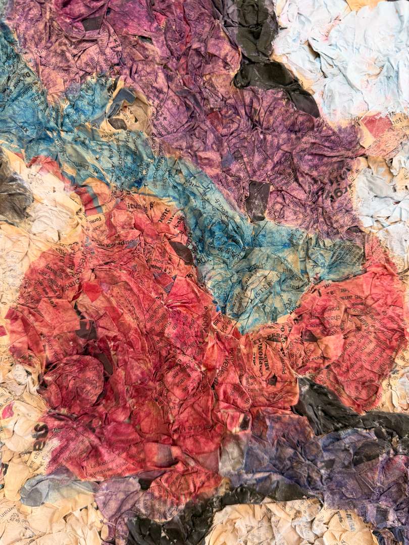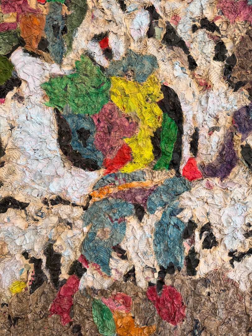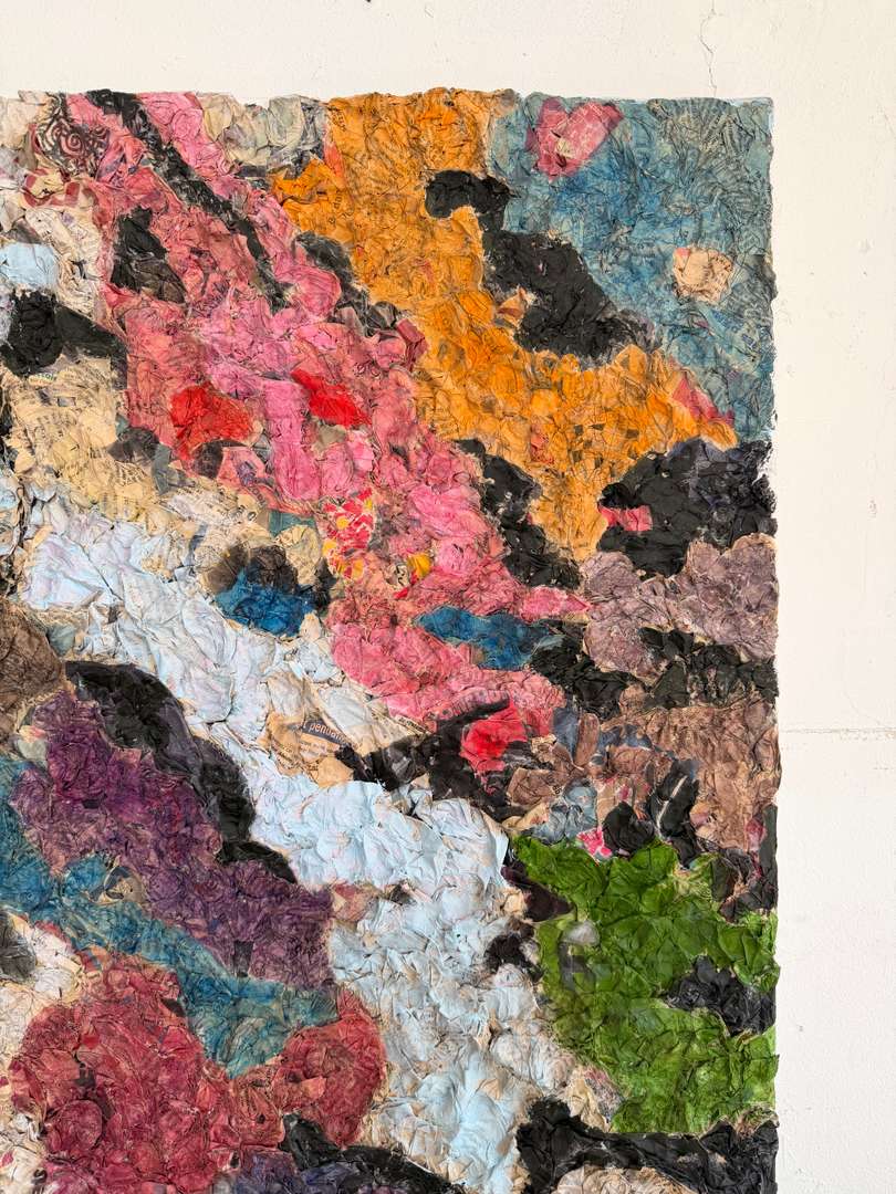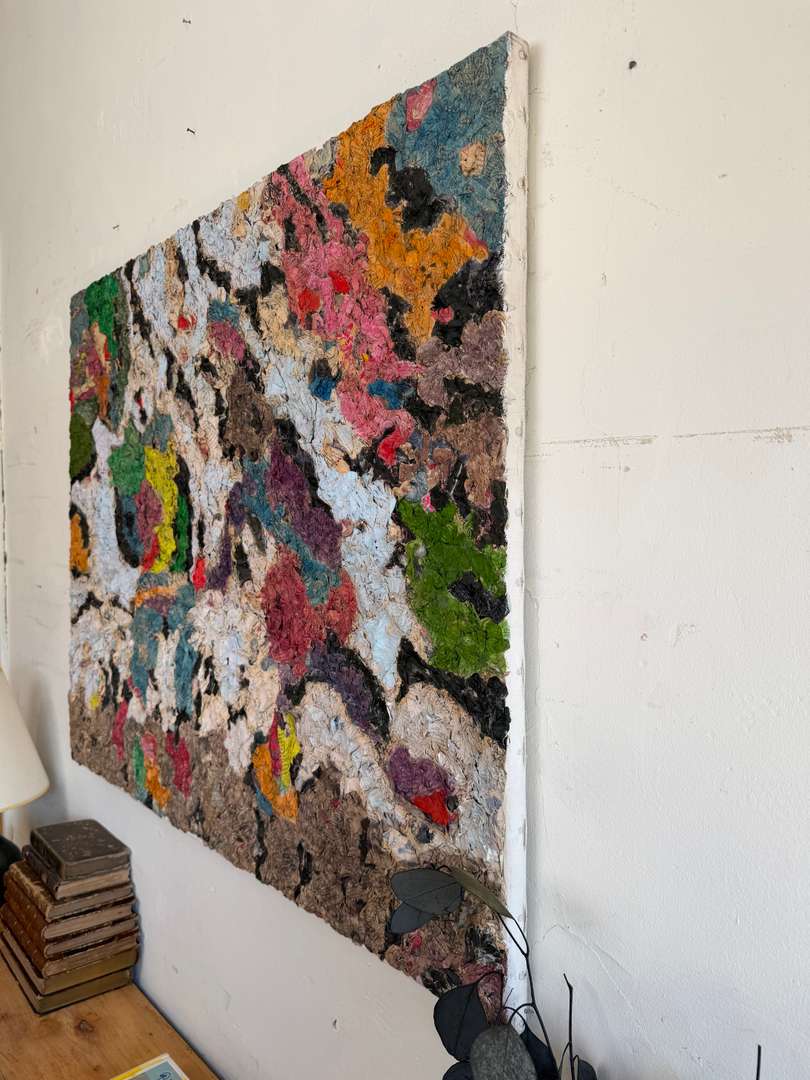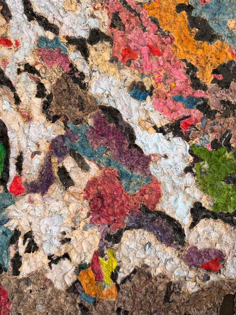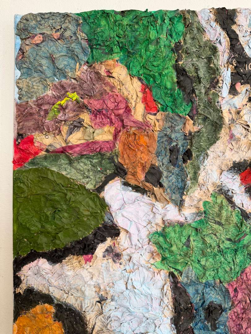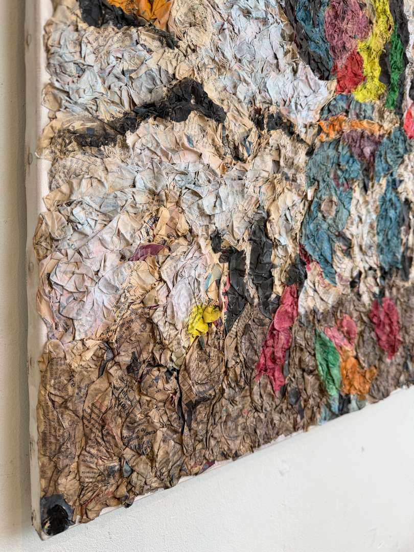 Travail de matière en relief, collage de papiers imprimés et couleurs vives, typique des recherches plastiques de cette période.
