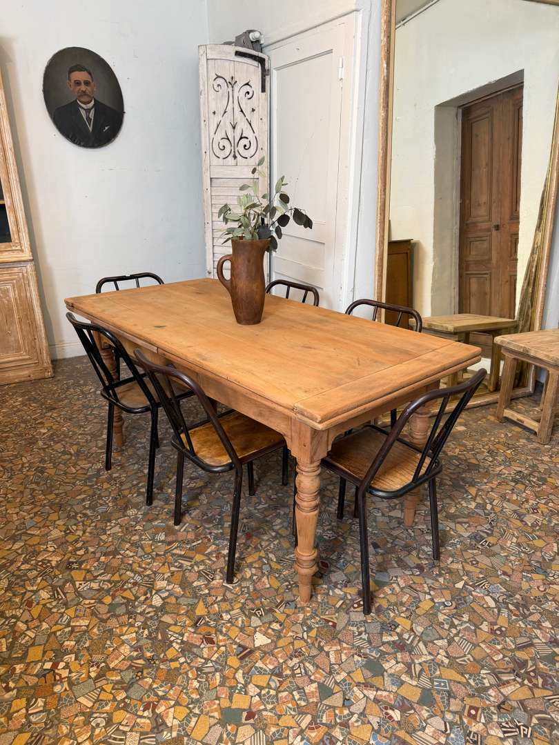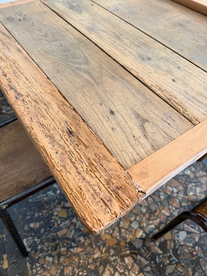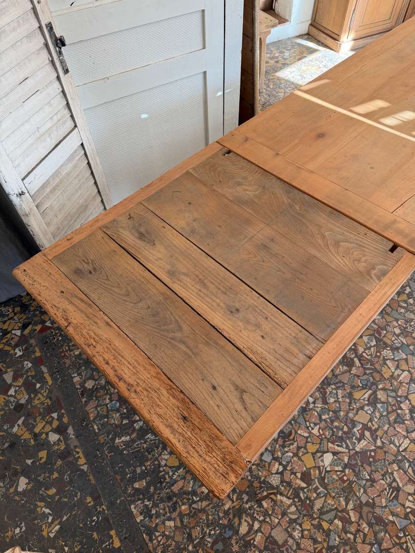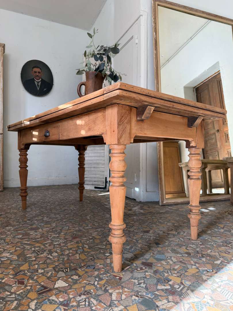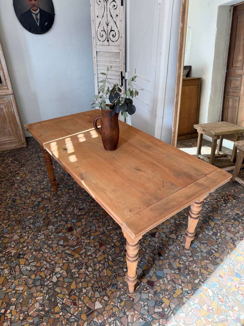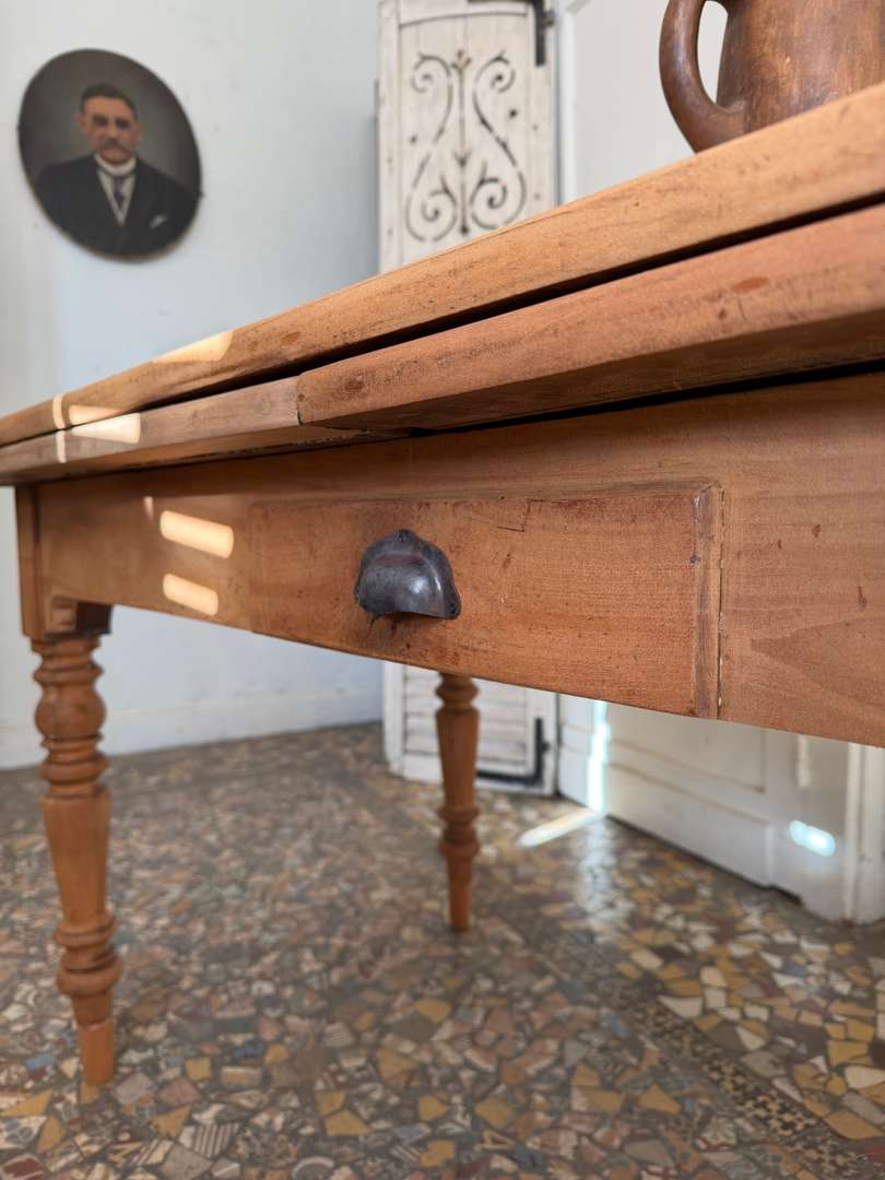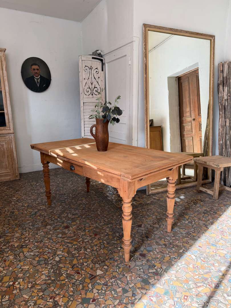 Ancienne table de ferme en merisier, datant de la fin du 19ᵉ siècle. Elle repose sur des pieds tournés et présente un tiroir en façade (factice).