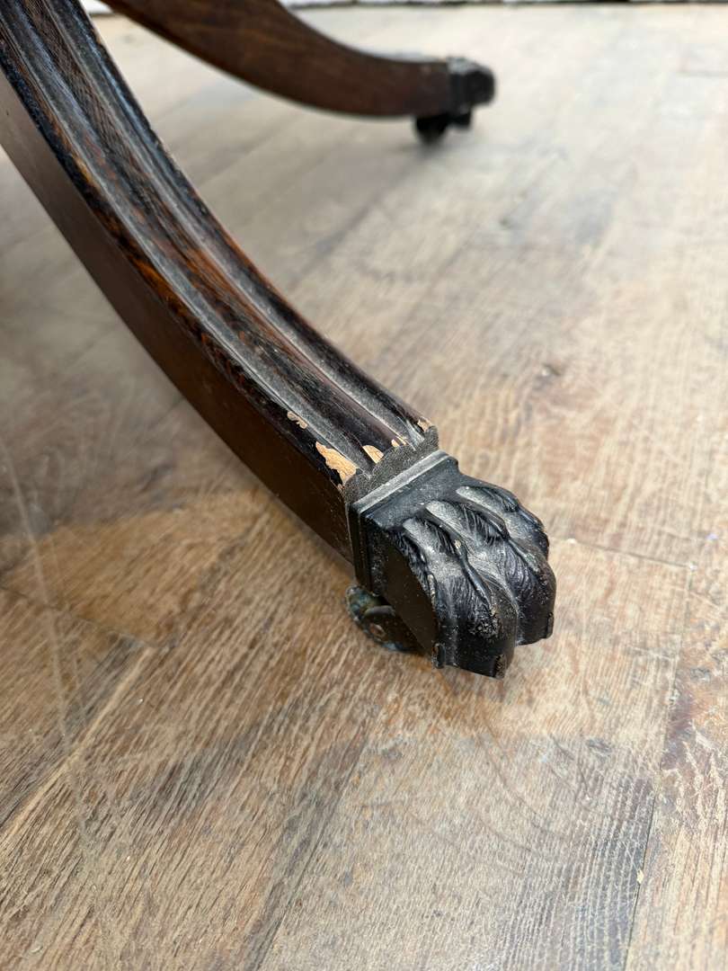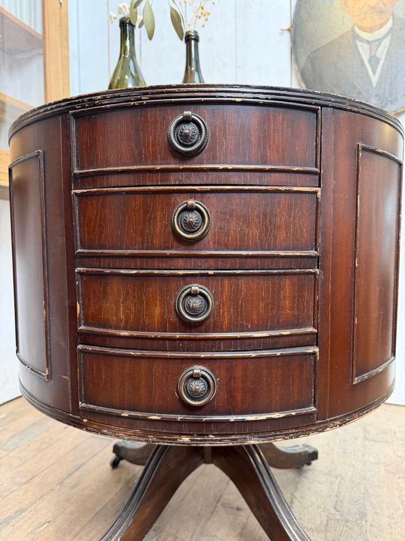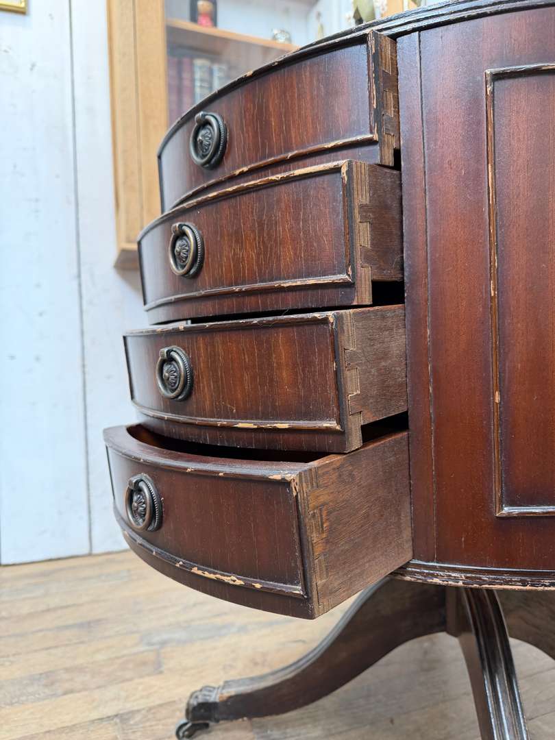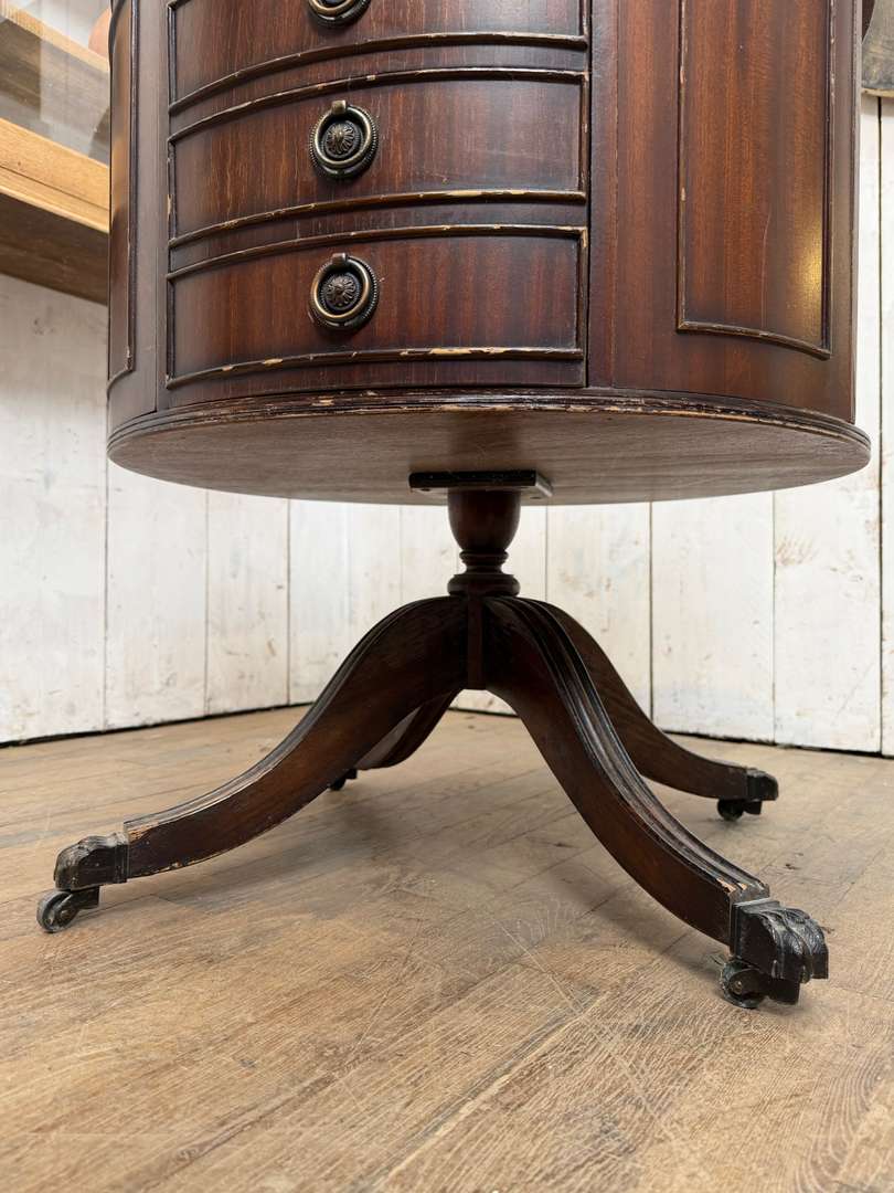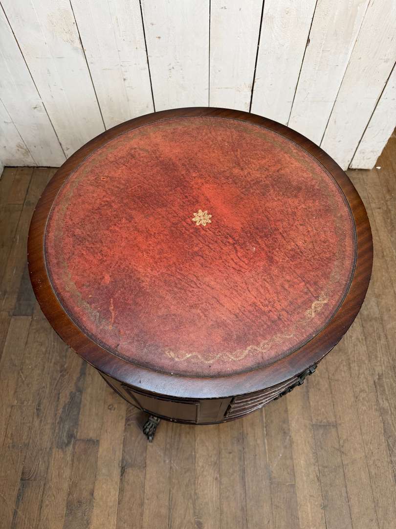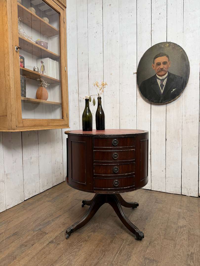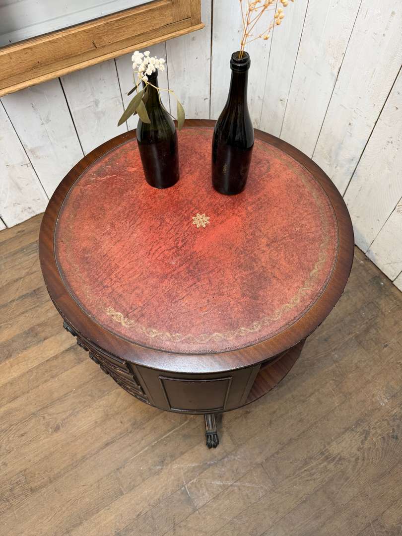 Ancienne table bar faisant également office de bibliothèque pivotante. Meuble tournant reposant sur roulettes, conçu pour être placé au centre d’une pièce. Dessus gainé de cuir d’origine, avec une jolie patine du temps. Intérieur compartimenté permettant de ranger livres, bouteilles ou objets. Un meuble aussi pratique que décoratif, typique des intérieurs bourgeois de la fin du XIXe siècle.