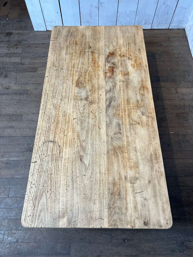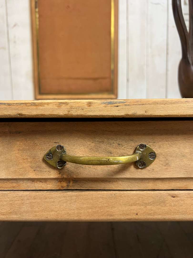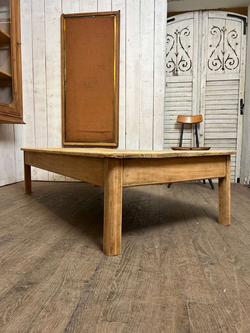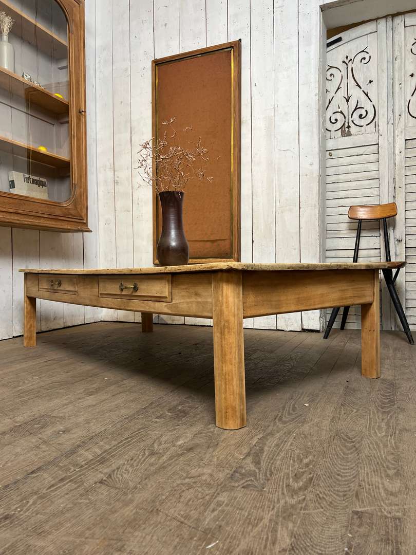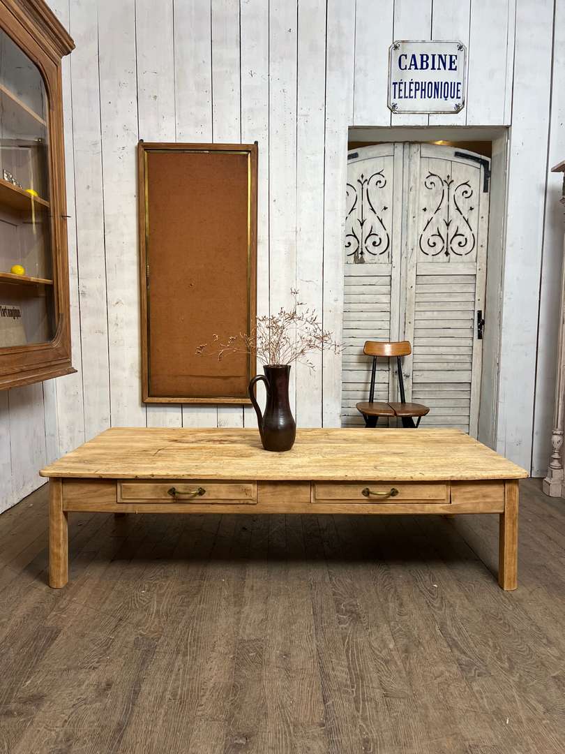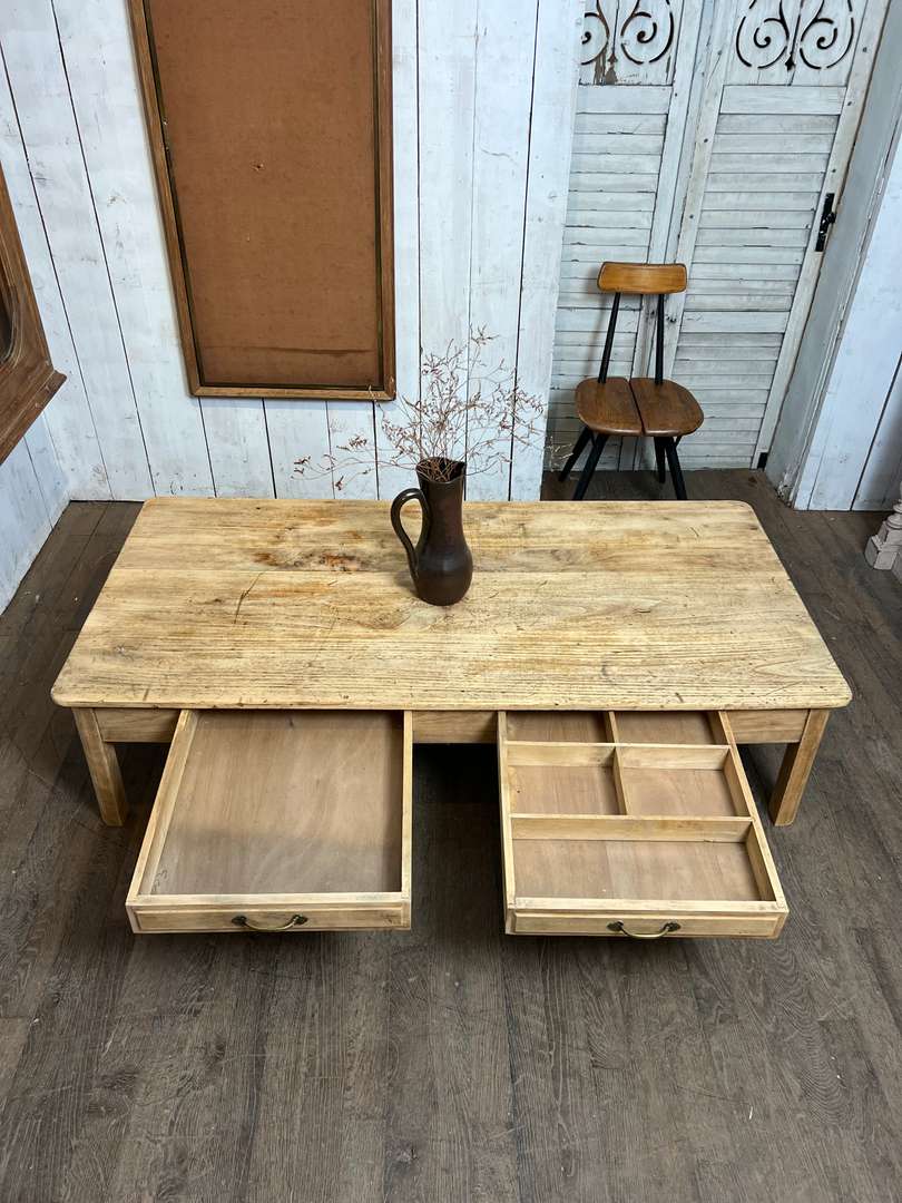 Ancienne table basse en peuplier, laissée en bois brut. Elle dispose de deux grands tiroirs, dont un compartimenté, avec poignées en laiton d’origine. Le bois brut permet de la laisser naturelle ou d’y appliquer la finition de votre choix.