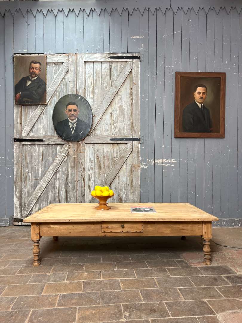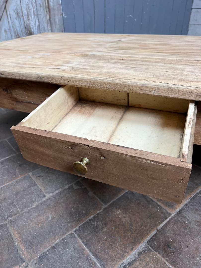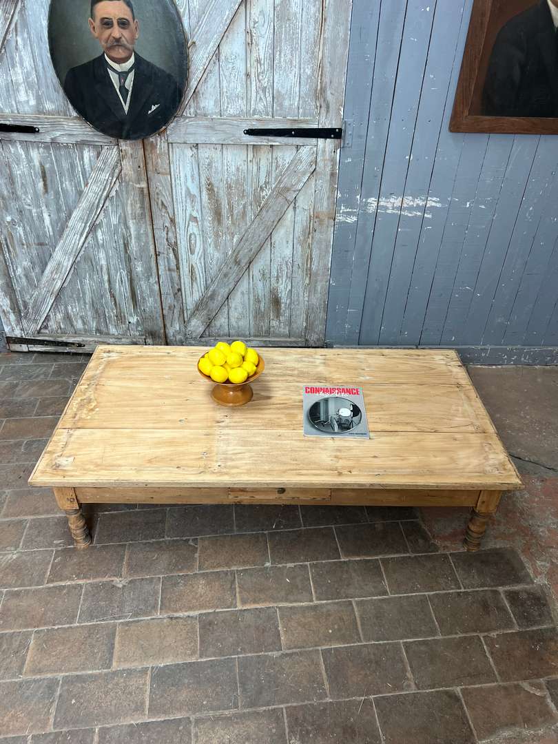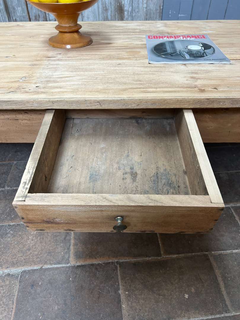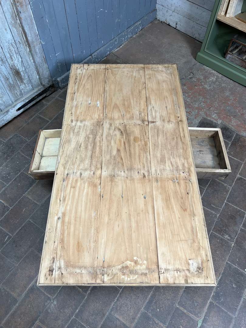 Table basse ancienne en peuplier – XXe siècleCe produit est venduTable basse ancienne en peuplier, laissée en bois brut et marquée par ses traces du passé. Elle est composée de deux tiroirs, un de chaque côté, et repose sur quatre pieds tournés. #tablebasse #peuplier #mobilierancien #boisbrut #decoauthentiqueDimensionsLargeur148 cmProfondeur78 cmHauteur38 cmRenseignementsRéférence2538008