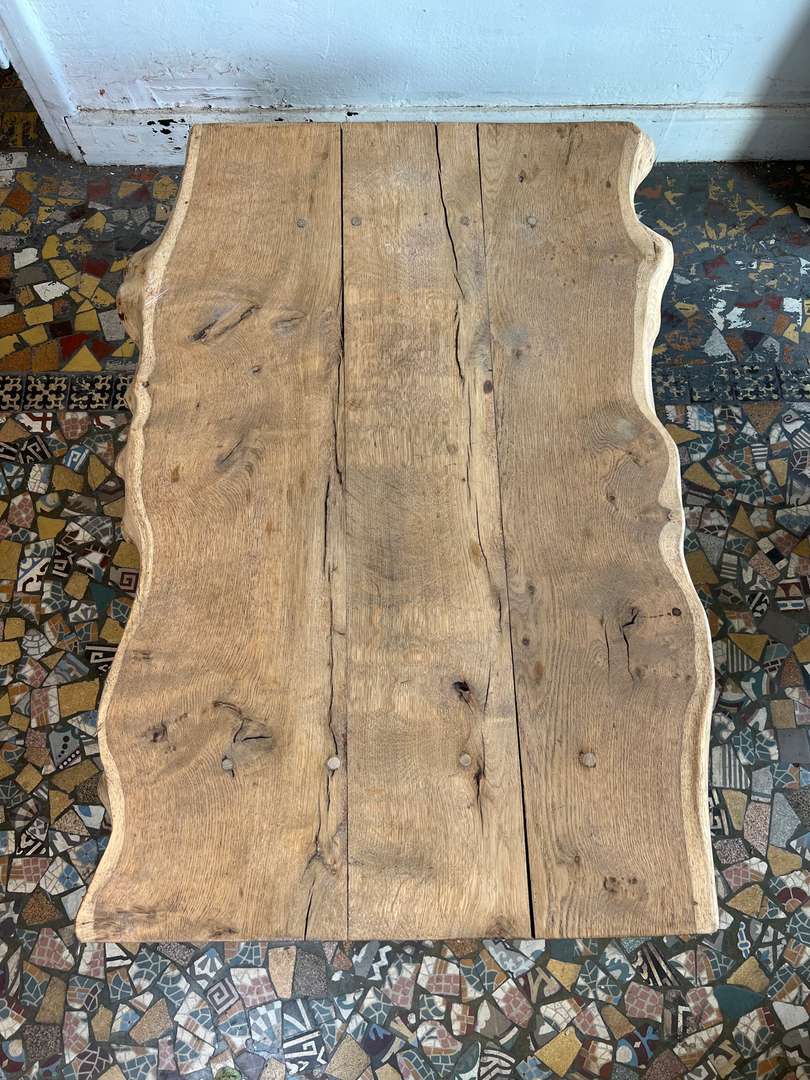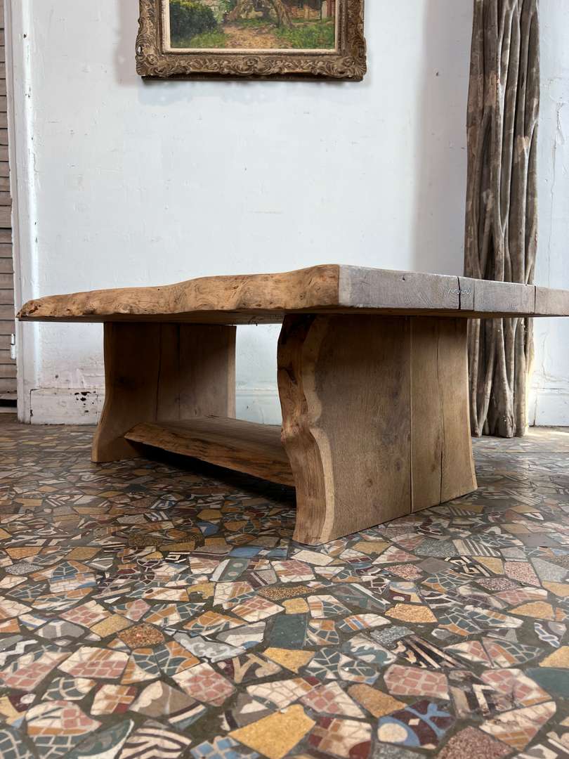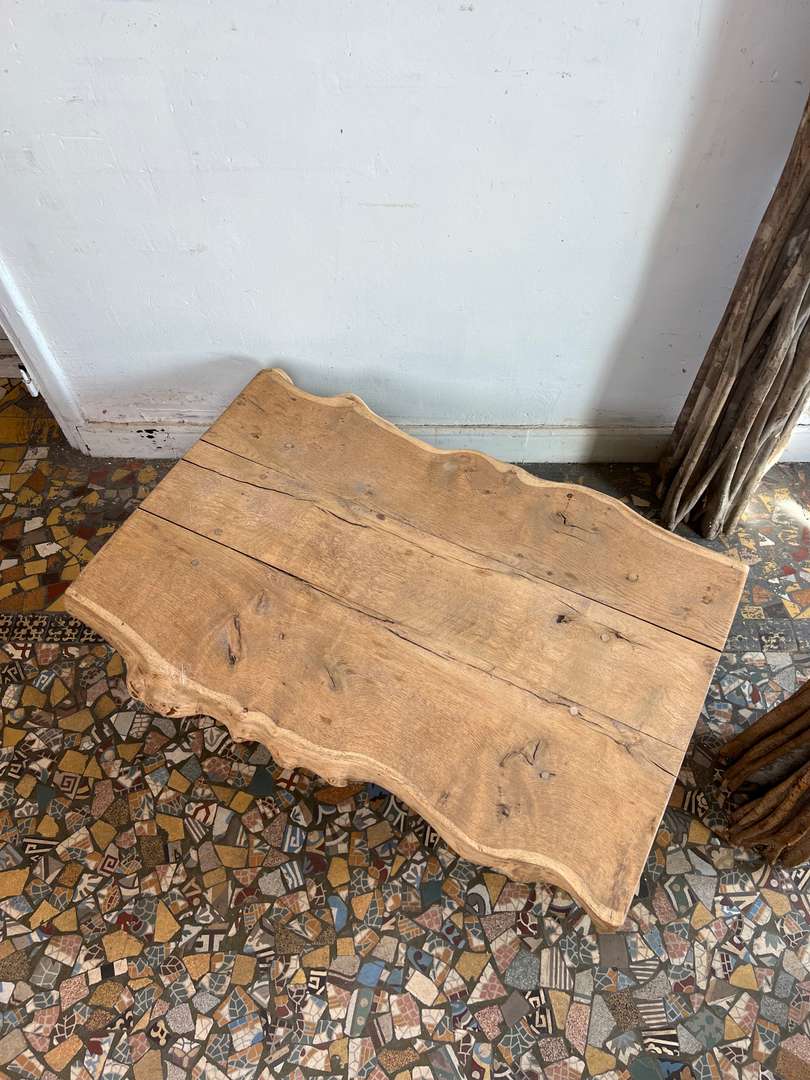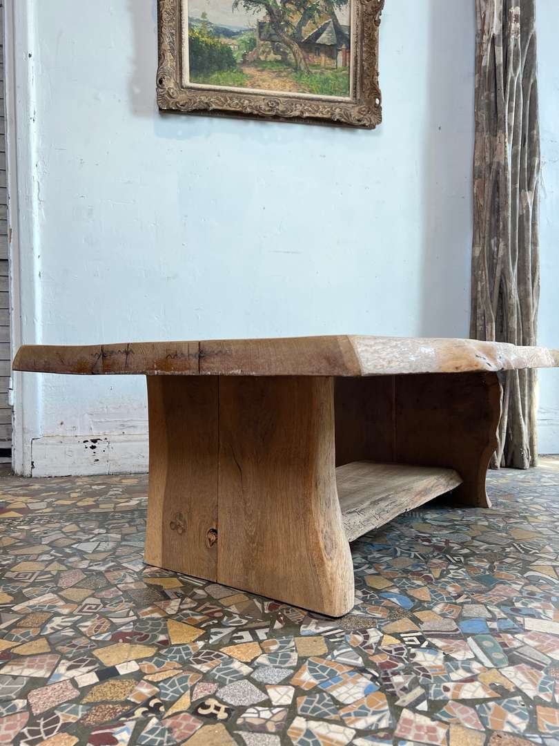 Ancienne table basse des années 50, réalisée en chêne brut. Son plateau aux bords irréguliers lui donne une allure sculpturale typique du style brutaliste. Compacte, elle est idéale pour aménager un petit espace.