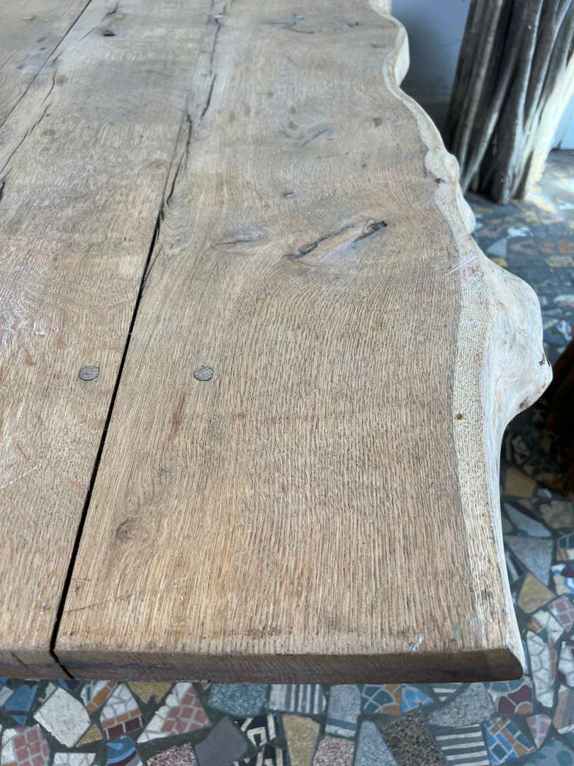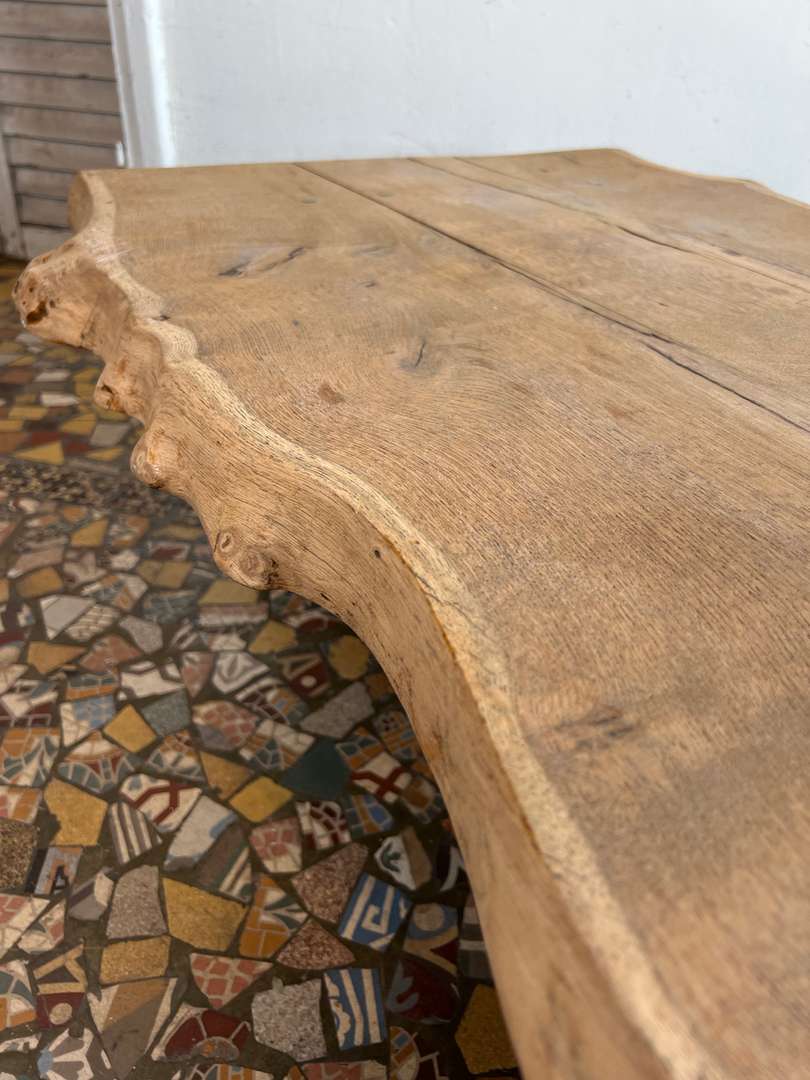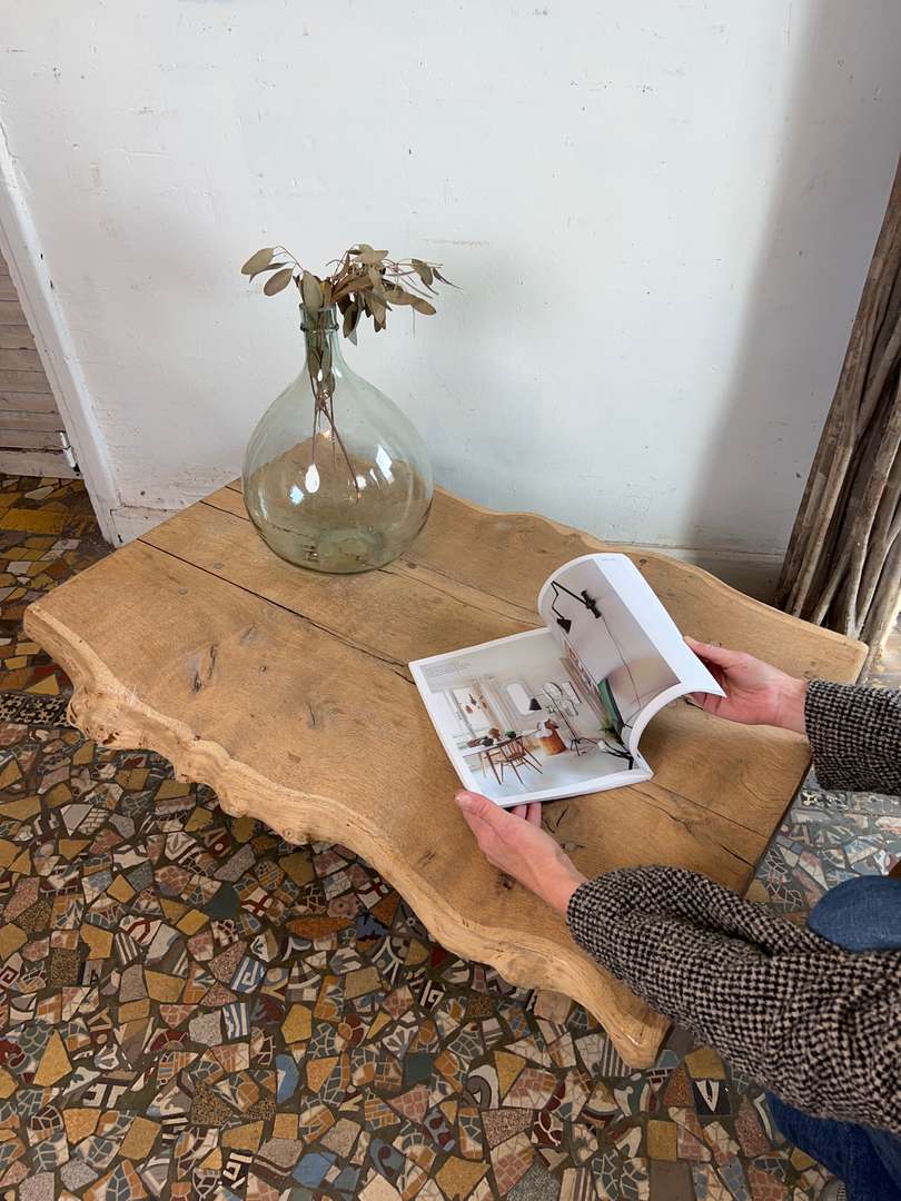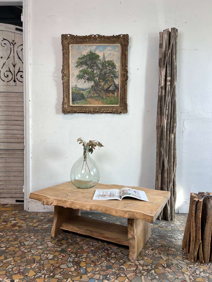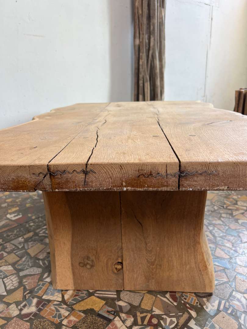 Ancienne table basse des années 50, réalisée en chêne brut. Son plateau aux bords irréguliers lui donne une allure sculpturale typique du style brutaliste. Compacte, elle est idéale pour aménager un petit espace.