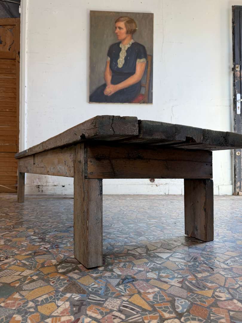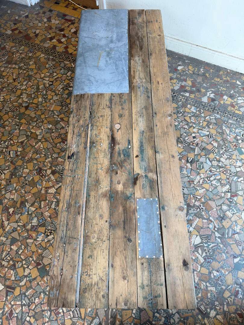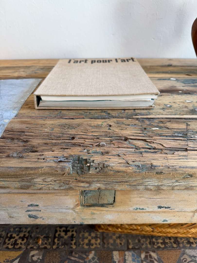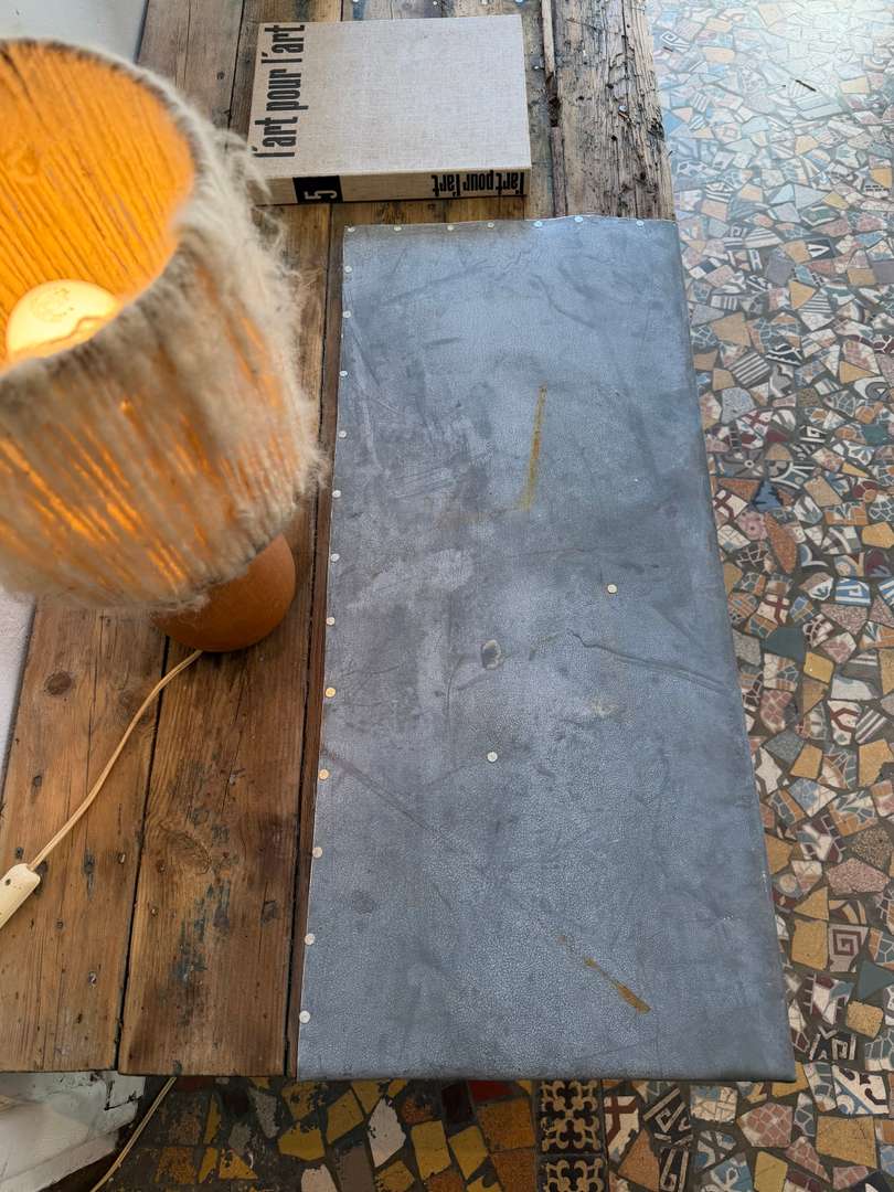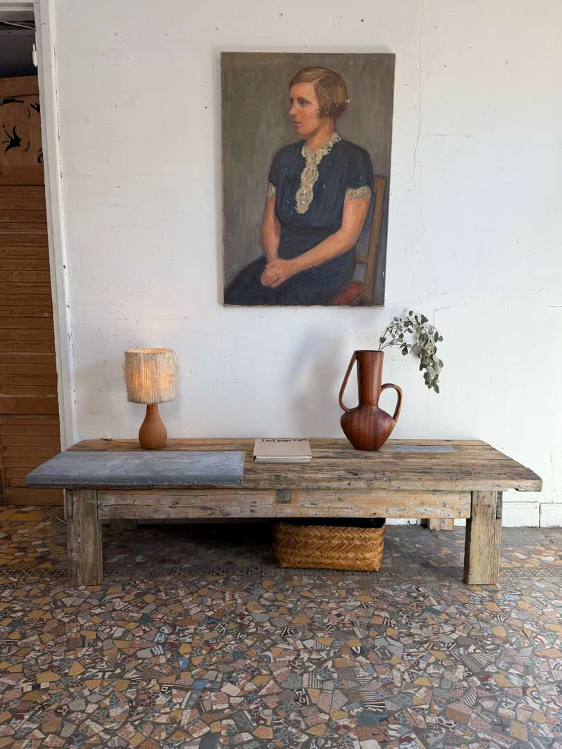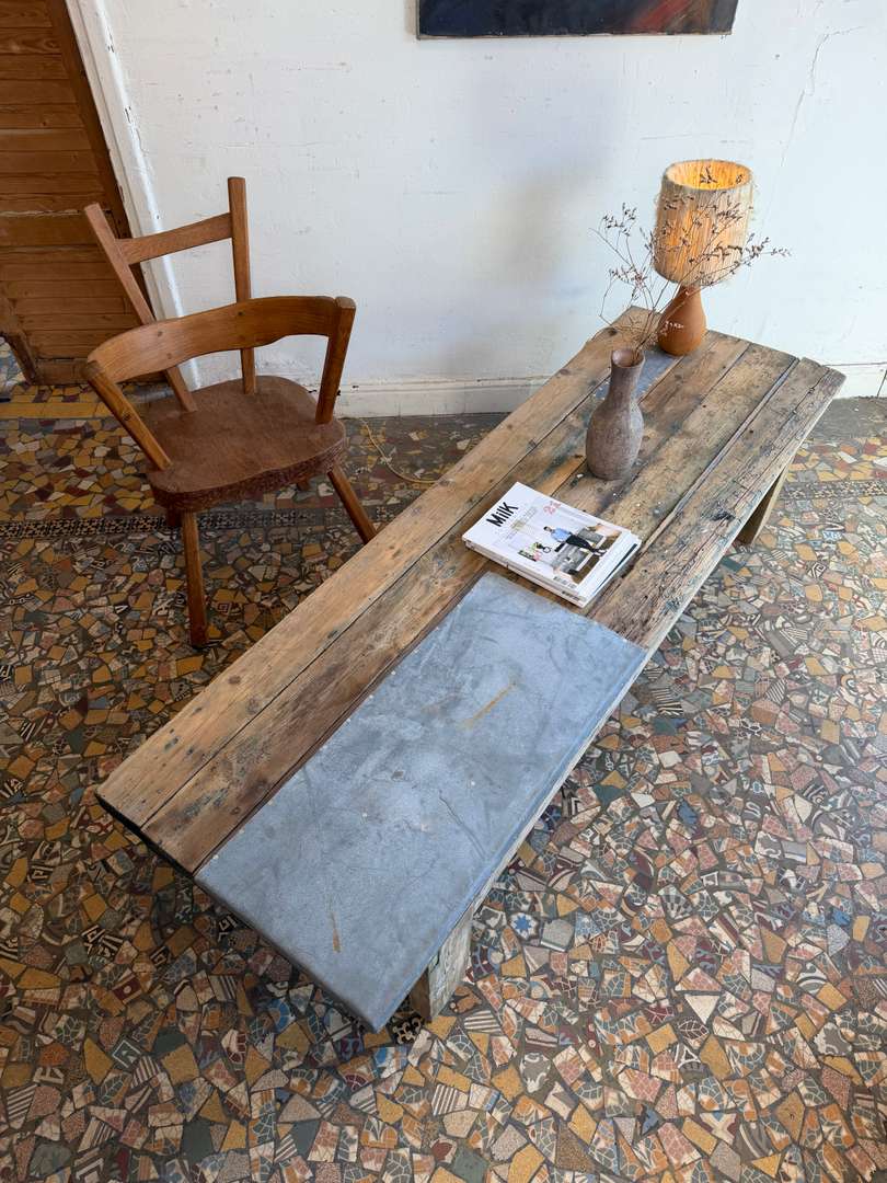 Table basse en sapin et zinc – XXe siècle 480 € Ajouter au panierAncienne table basse en sapin XXe siècle Plateau en planches avec empiècements en zinc Piètement simple Bois patiné, traces d’usage visibles Peut être utilisée en table basse, console ou en extérieur #tablebasse #console #boisancien #zinc #meubledemetier DimensionsLargeur180 cmProfondeur58 cmHauteur41 cmRenseignementsRéférence2612006