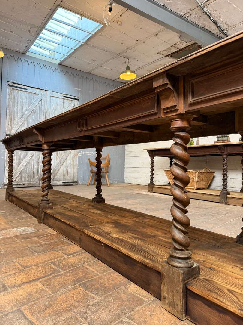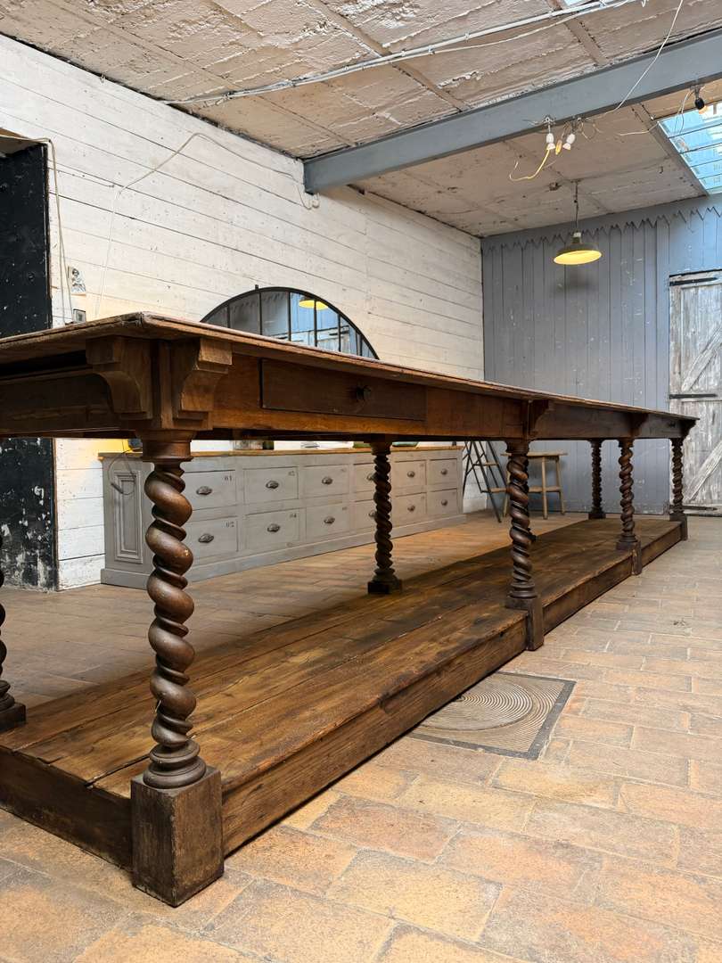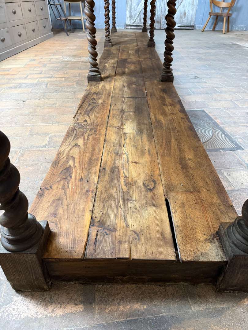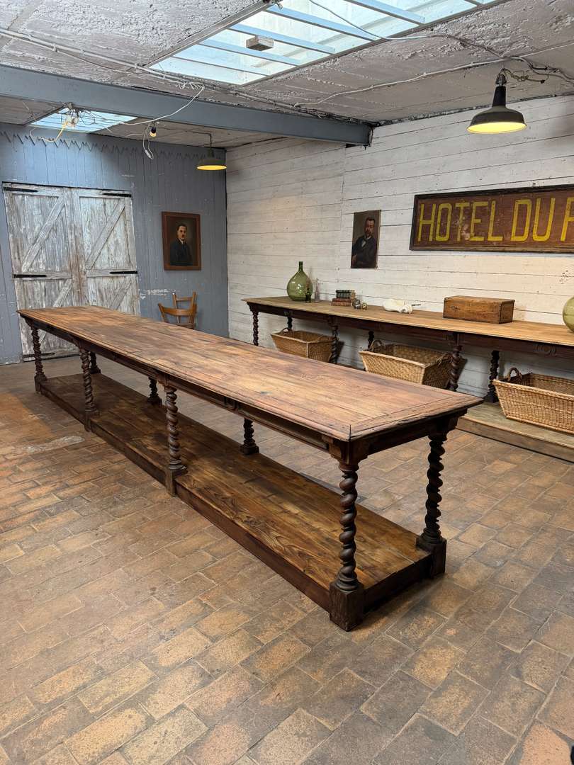 Très beau modèle à 8 pieds torsadés, élégant et peu courant. Deux tiroirs en ceinture. Large plateau supérieur en chêne, plateau bas en sapin.