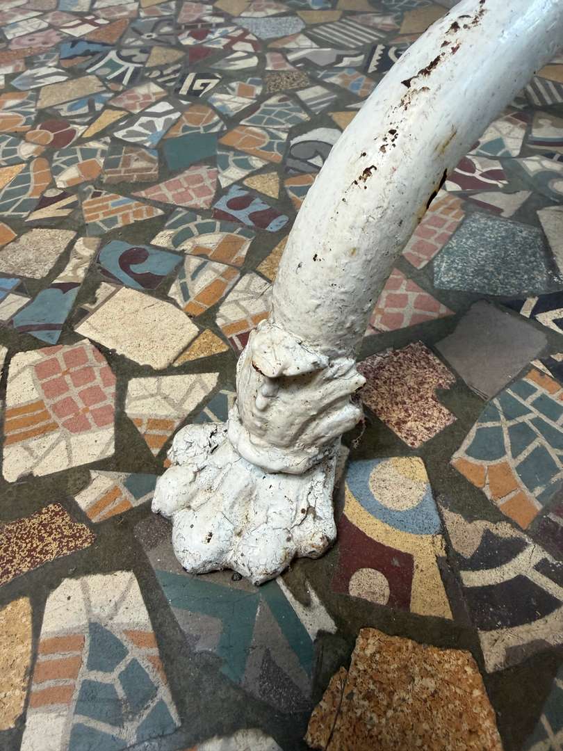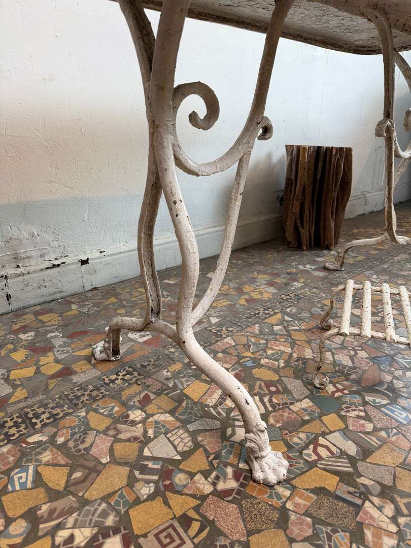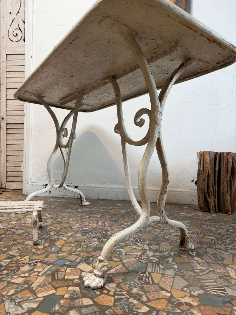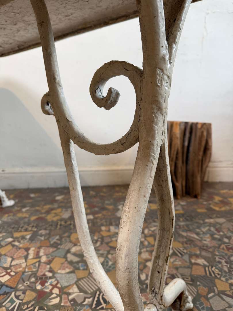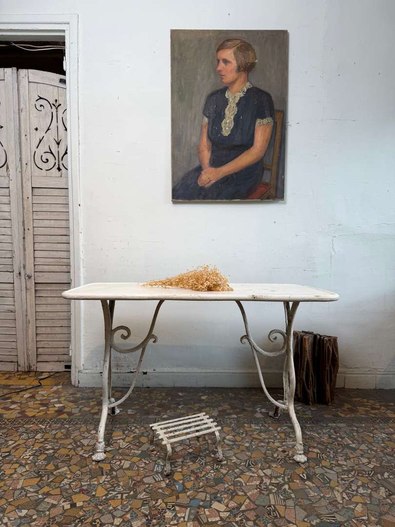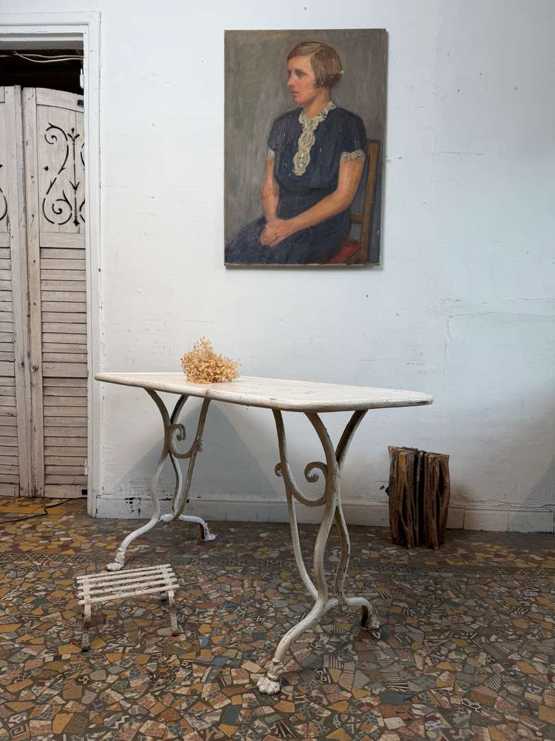 Authentique table de jardin Arras du XIXe siècle. Piètement en fonte aux lignes élégantes, plateau en métal avec une belle patine du temps. Parfaite en extérieur comme en intérieur, pour une ambiance jardin d’hiver ou atelier chic.