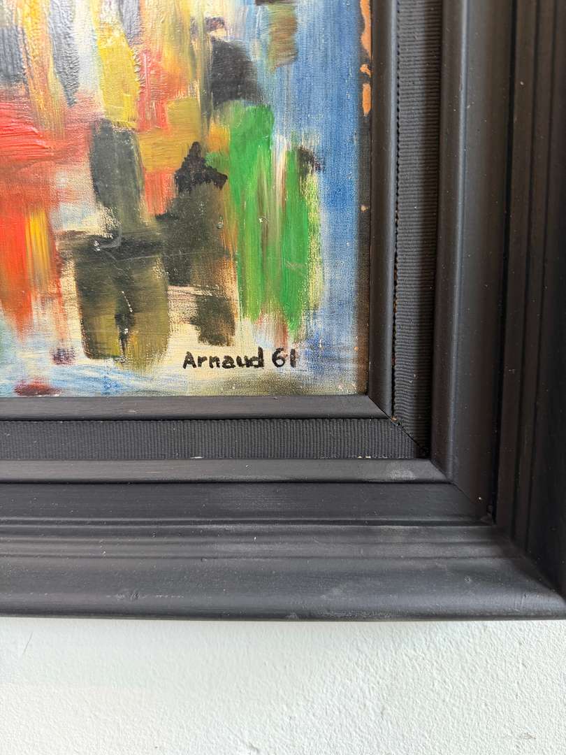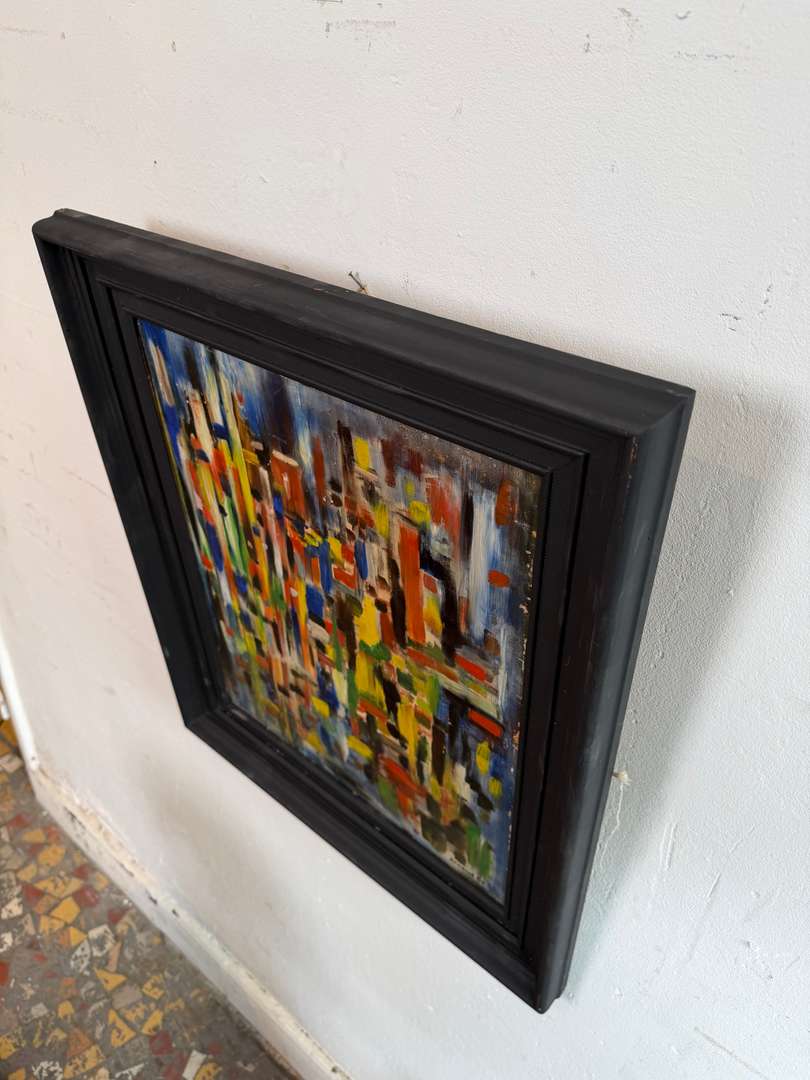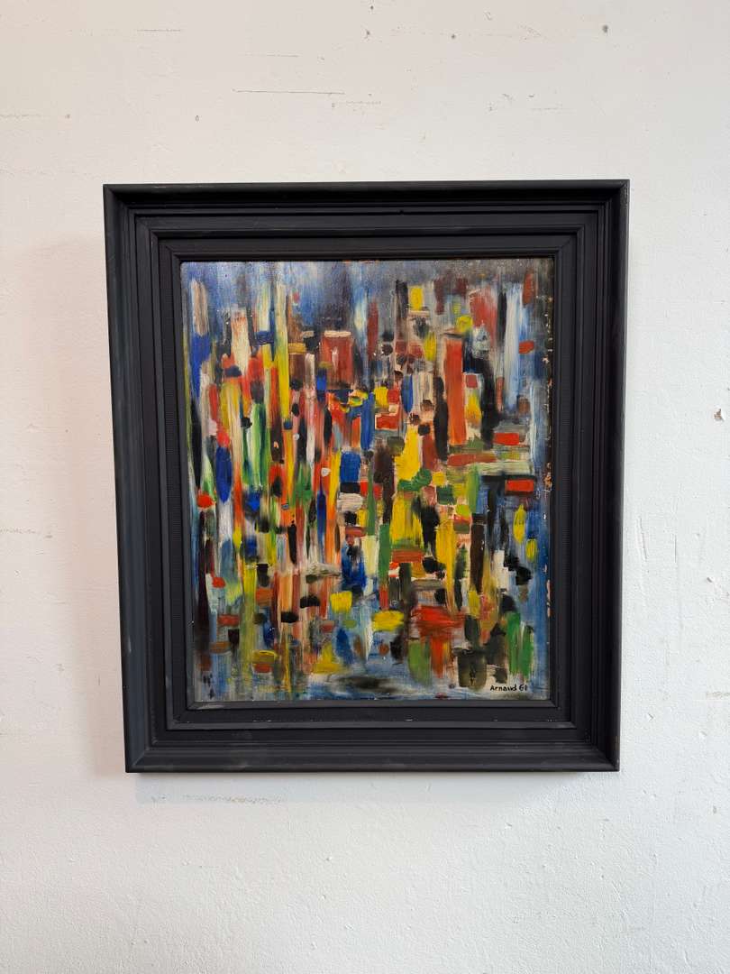 Tableau abstrait années 60 100 €Livraison france offerte Ajouter au panierPeinture graphique aux couleurs vibrantes, typique des années 60. Composition rythmée, pleine d’énergie, signée Arnaud G. Encadrement noir qui met parfaitement l’œuvre en valeur. #artabstrait #annees60 #tableauancienDimensionsLargeur50 cmProfondeur4 cmHauteur58 cmRenseignementsRéférence2604014
