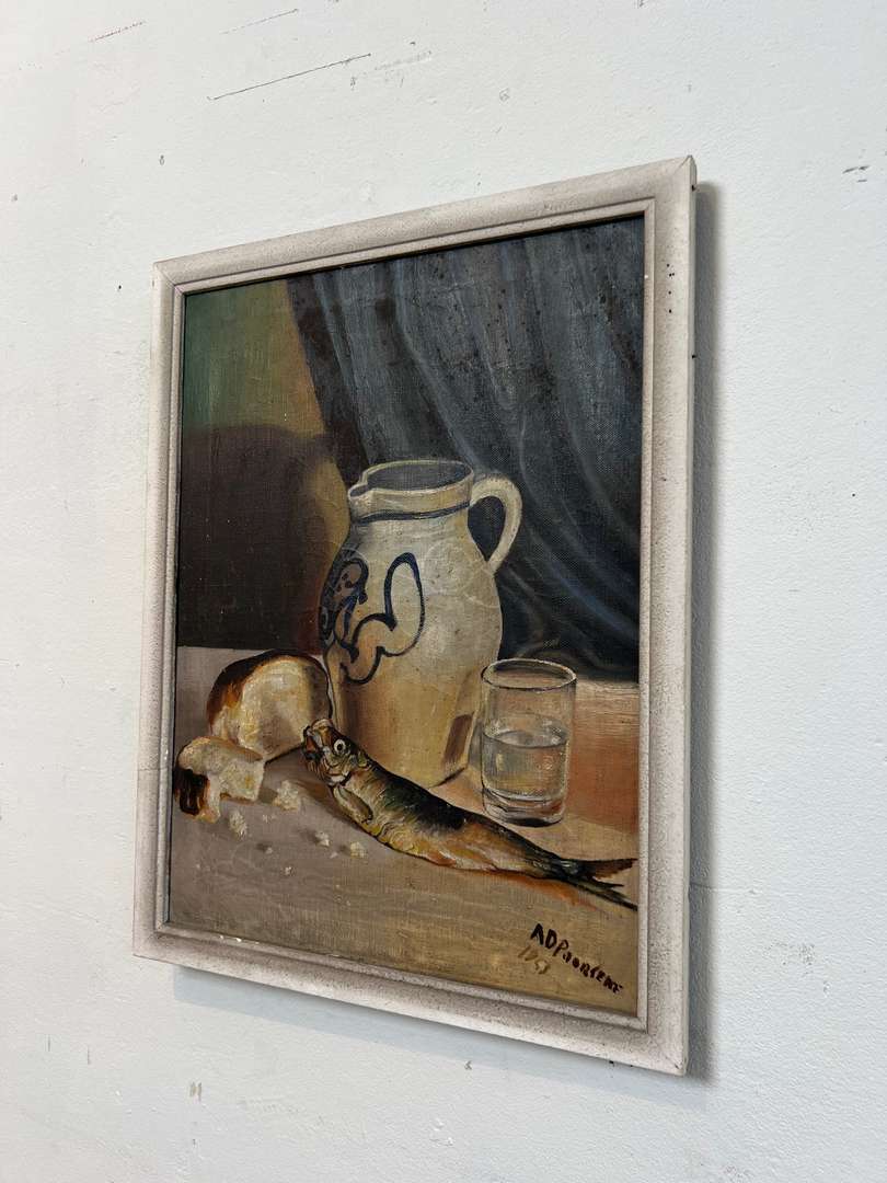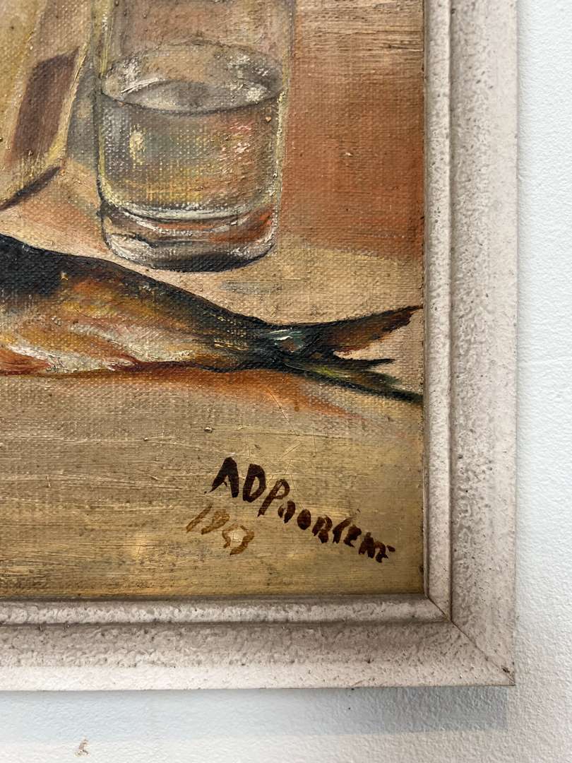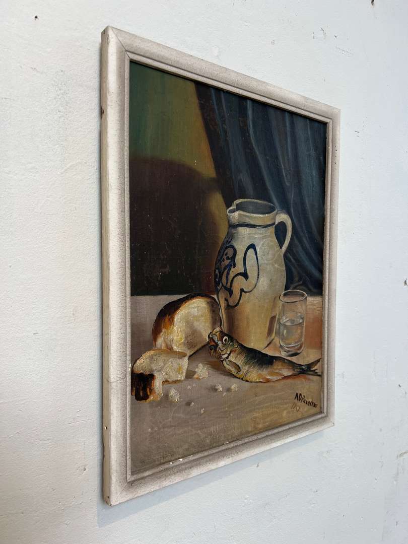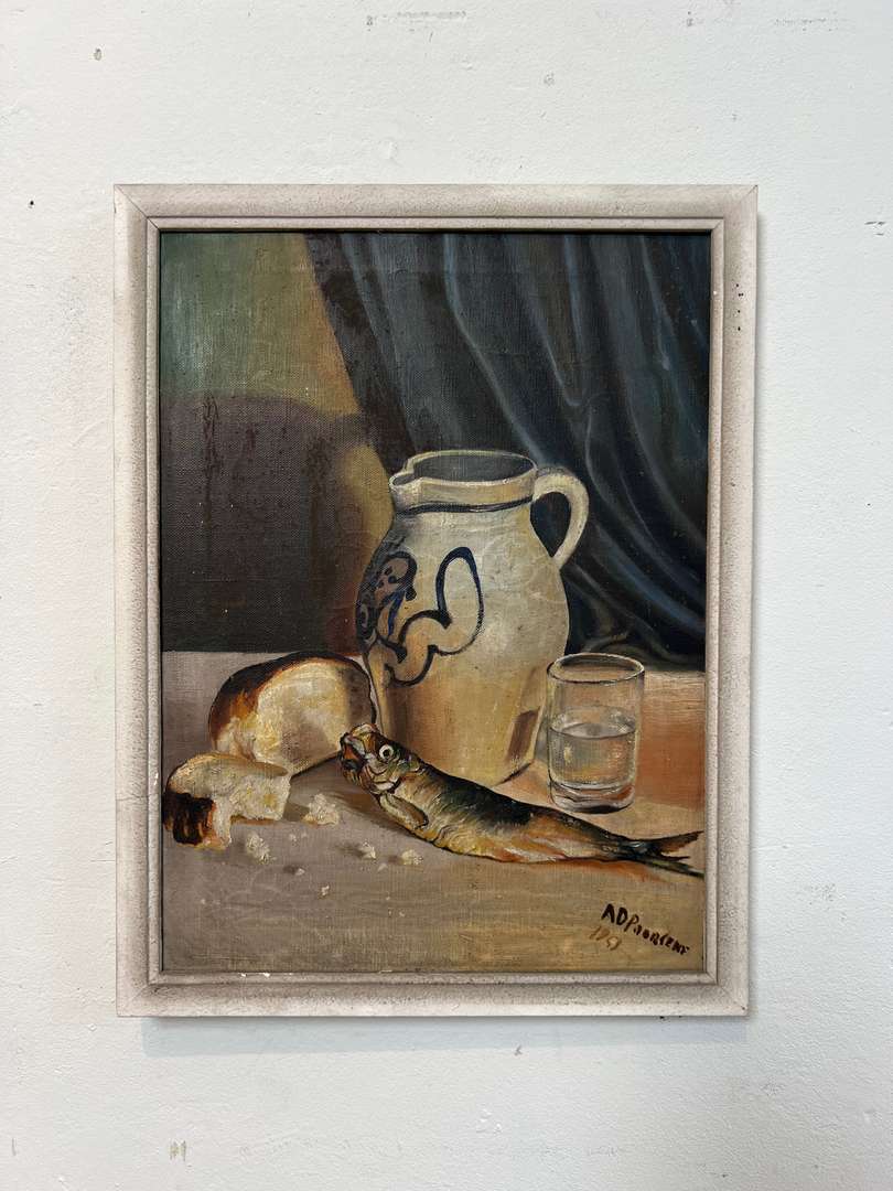 Tableau années 40 65 €Livraison france offerte Ajouter au panierPetit tableau des années 40 représentant une nature morte avec un pichet, du pain et un poisson. Joli témoignage d’époque, signé et présenté dans son cadre d’origine. #tableauancien #naturemorte #annees40DimensionsLargeur33.5 cmProfondeur2 cmHauteur43.5 cmRenseignementsRéférence2550012