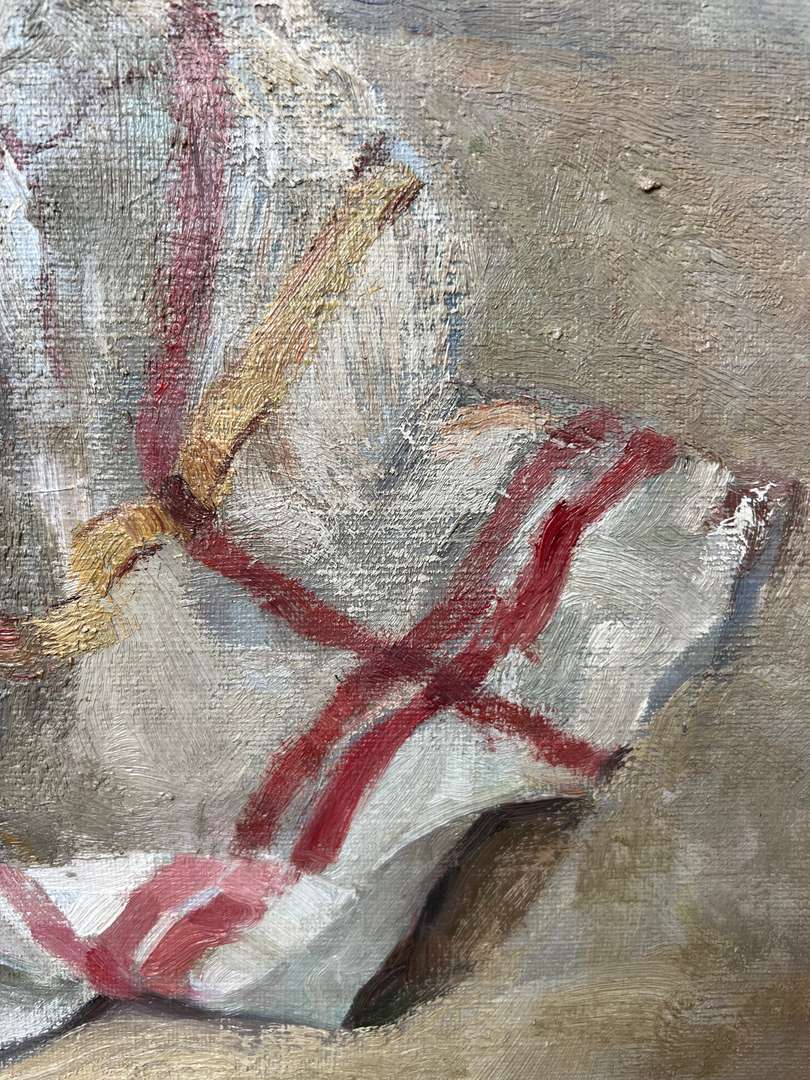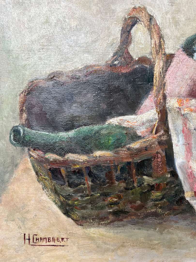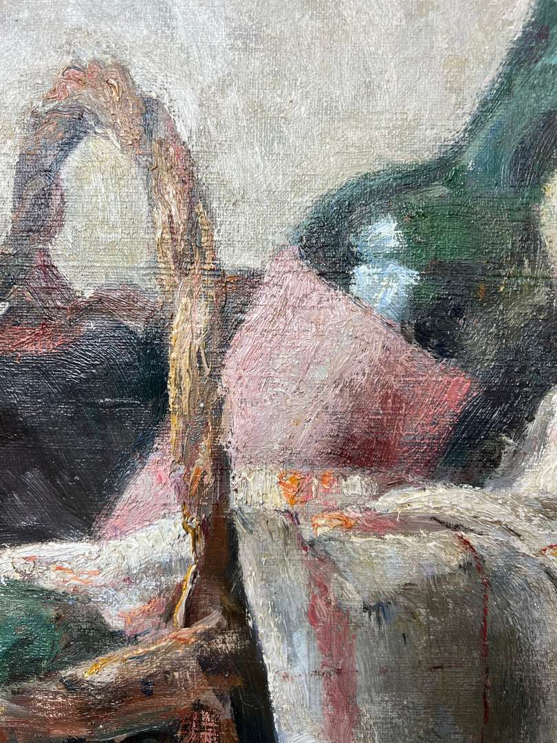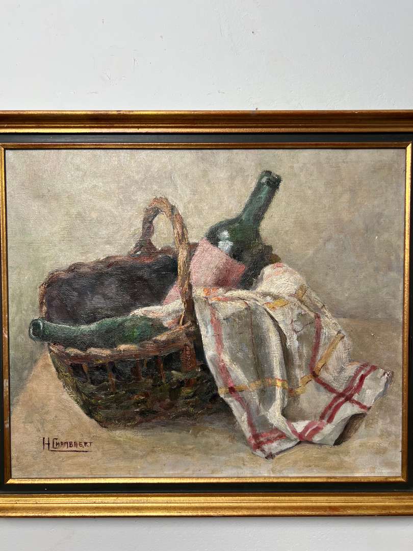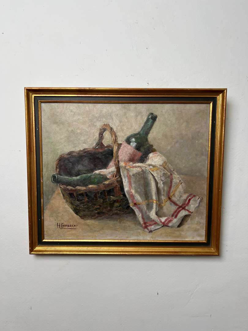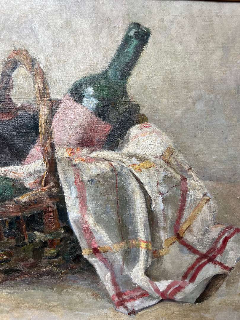 Ancien tableau de nature morte des années 30, représentant un panier, des bouteilles et un torchon aux tons doux. Jolie touche picturale, palette chaleureuse et cadre d’époque. Une scène simple et authentique qui apporte beaucoup de charme.