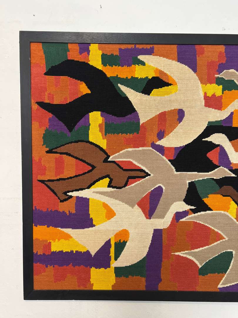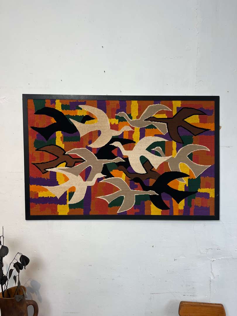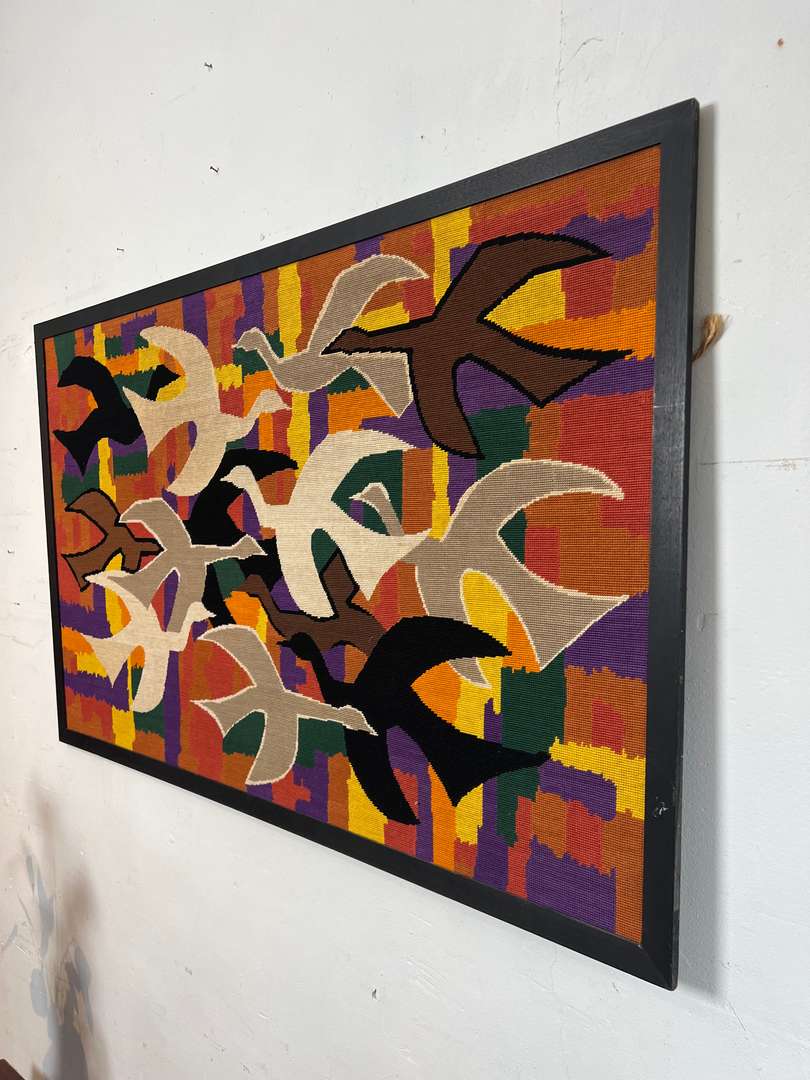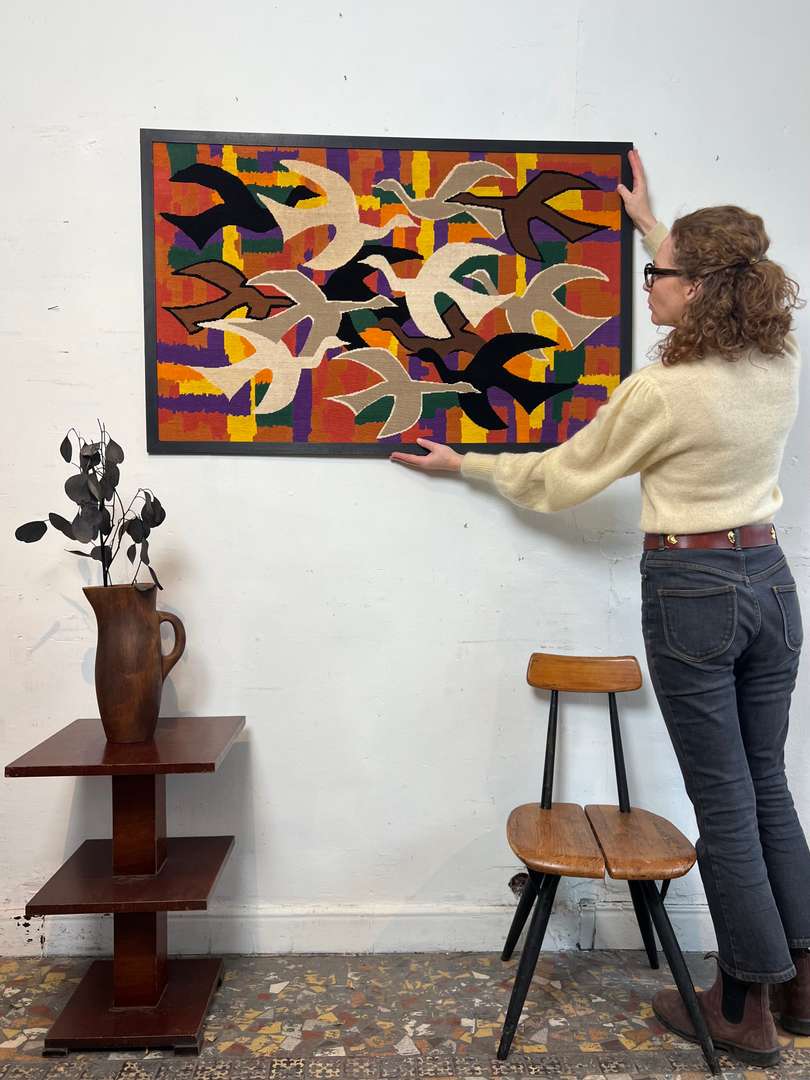 Tapisserie non signée des années 80 représentant un envol d’oiseaux sur un fond très coloré. Les teintes vives apportent du rythme et une belle présence décorative. Elle est montée dans un cadre noir, légèrement voilé.