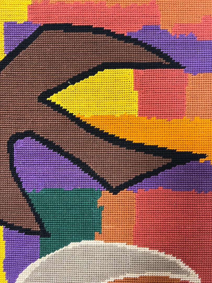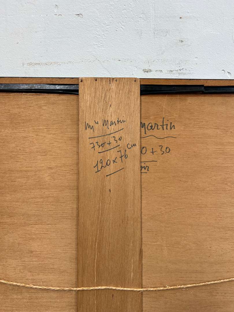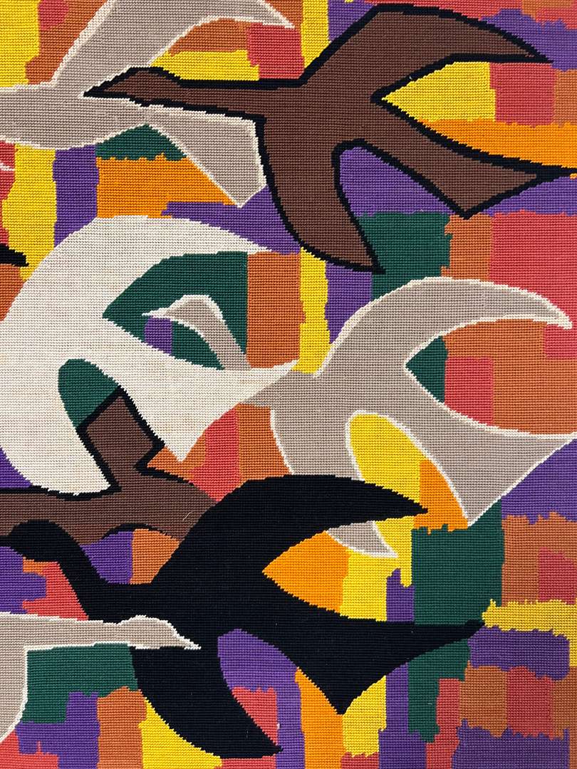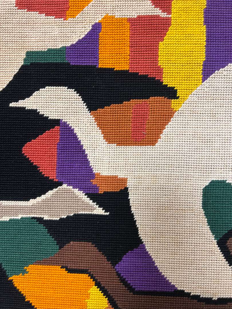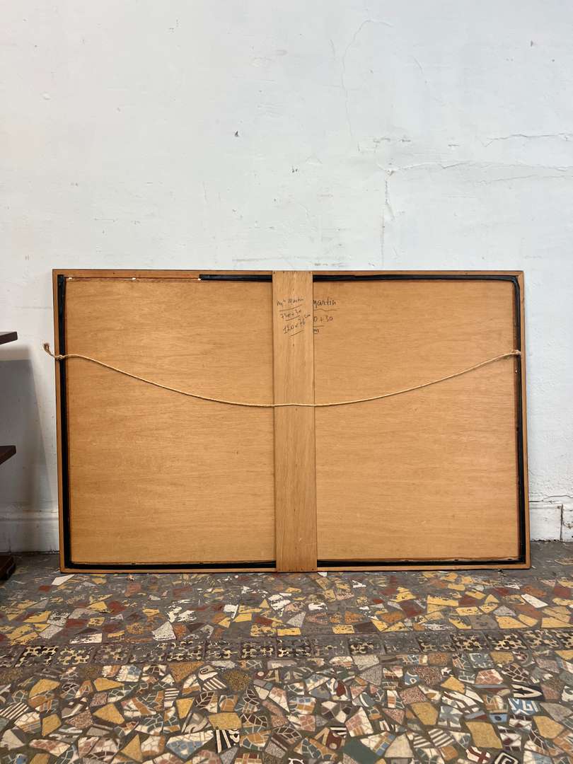 Tapisserie non signée des années 80 représentant un envol d’oiseaux sur un fond très coloré. Les teintes vives apportent du rythme et une belle présence décorative. Elle est montée dans un cadre noir, légèrement voilé.