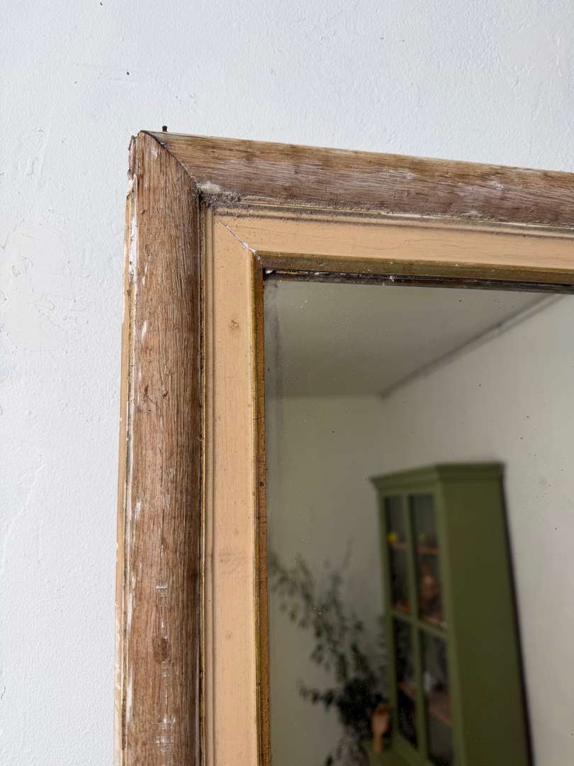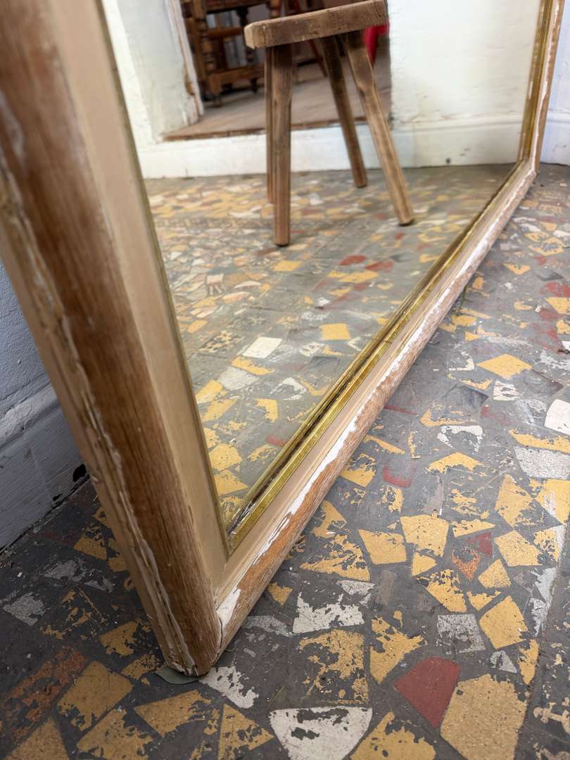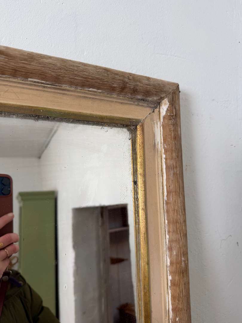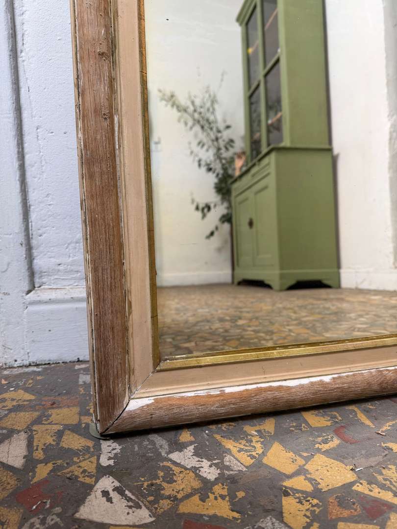 Très grand miroir ancien en chêne, XIXᵉ siècle, à poser ou à appuyer contre un mur. Cadre en chêne avec contour intérieur doré, présentant une patine du temps homogène. Miroir au nitrate d’argent, avec traces et nuances liées à son ancienneté. Fond en bois panneauté d’origine. Une pièce de caractère qui apporte profondeur et lumière à un intérieur.