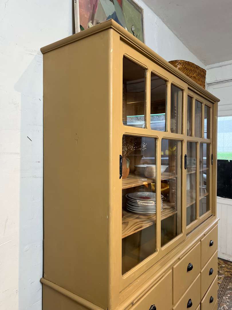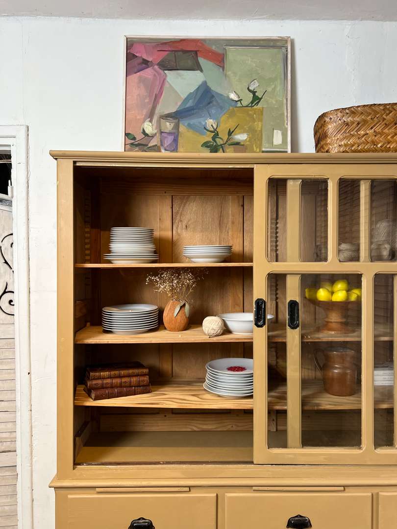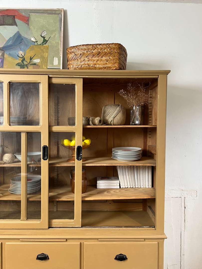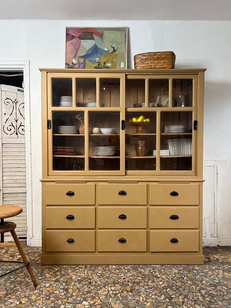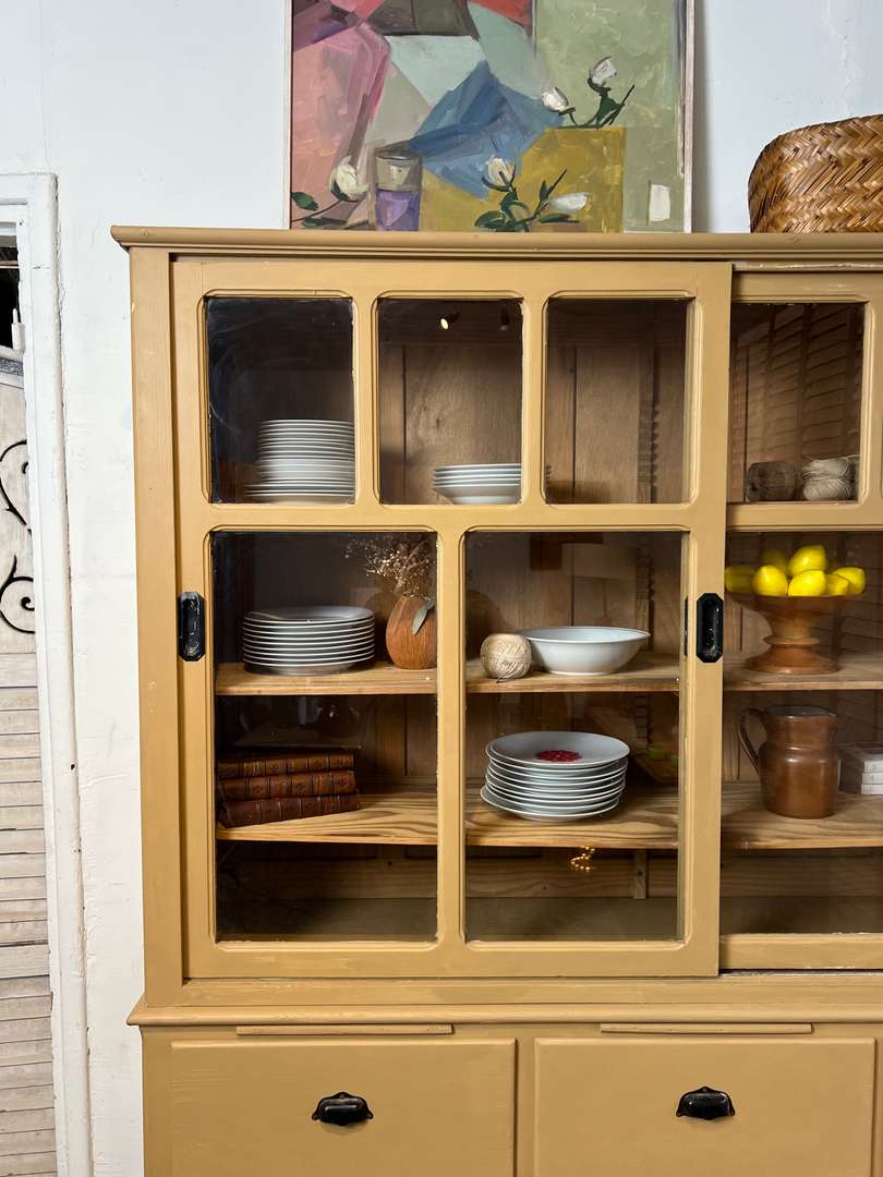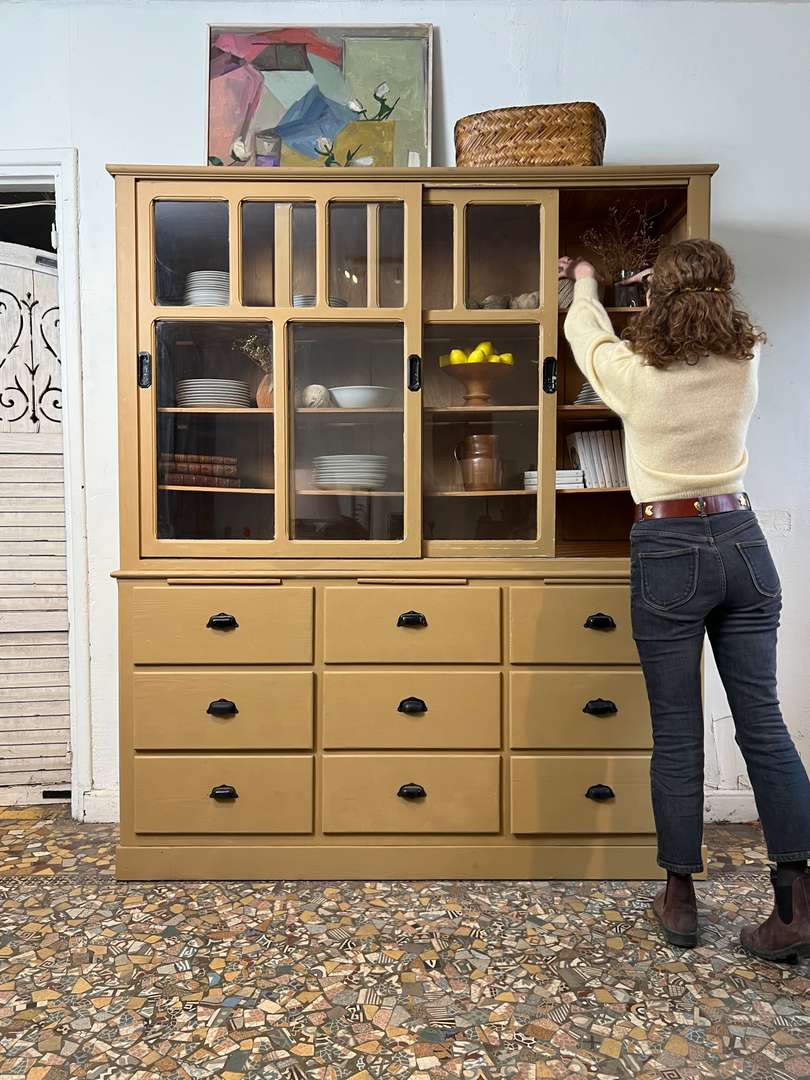 Charmant vaisselier en deux parties des années 50, entièrement repeint dans une jolie teinte ocre. Il offre une partie basse composée de tiroirs et trois petites tablettes coulissantes très pratiques, ainsi qu’une partie haute avec portes vitrées coulissantes et étagères pour exposer votre vaisselle. Un meuble fonctionnel et décoratif, parfait pour une cuisine ou une salle à manger.