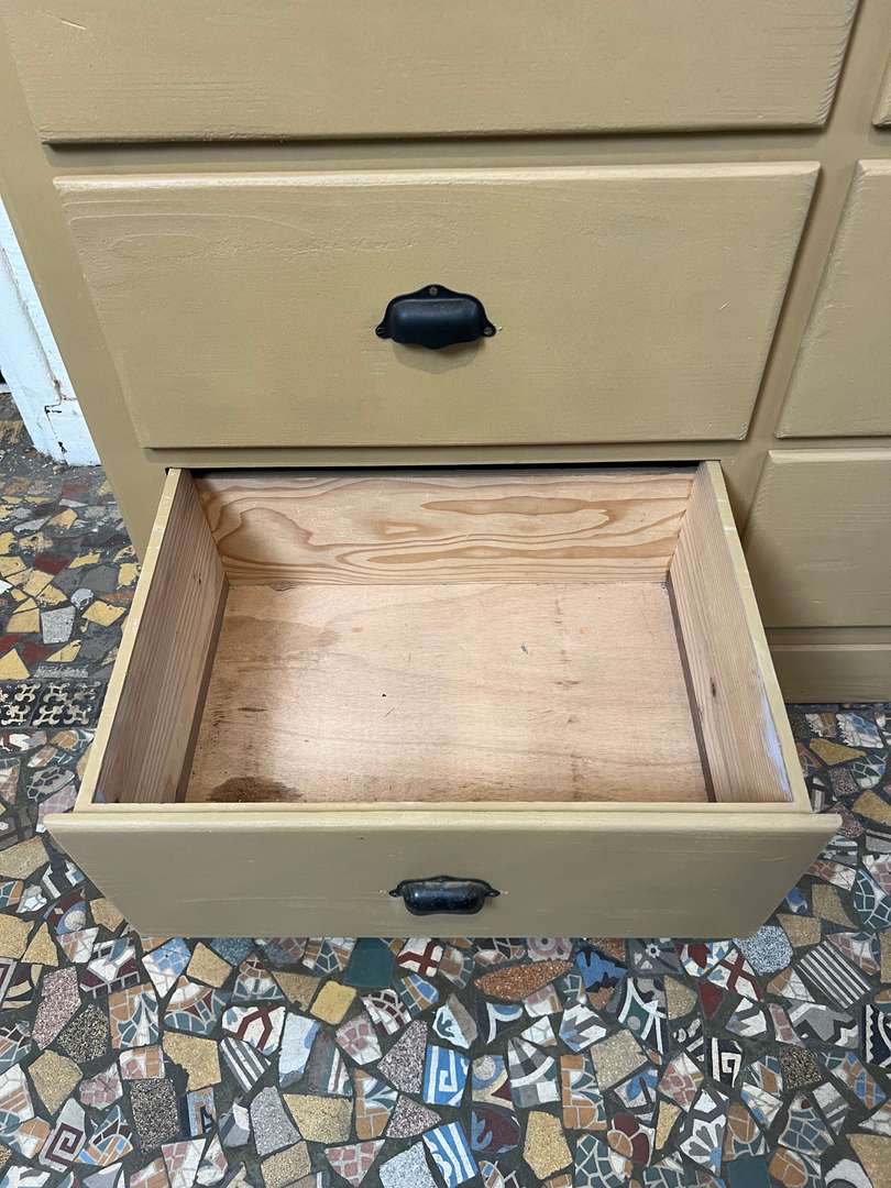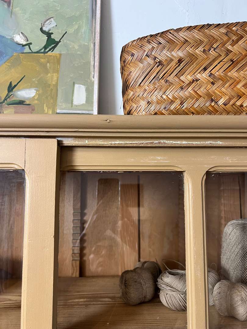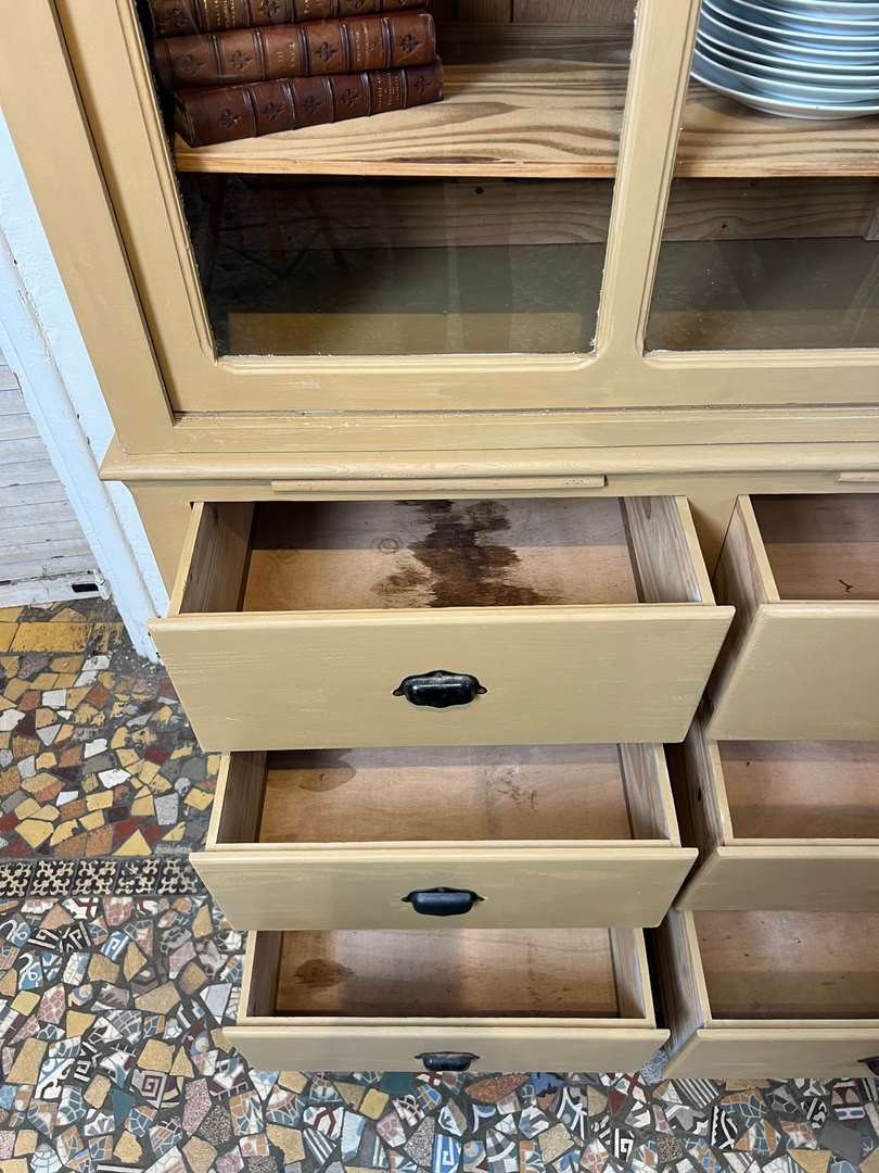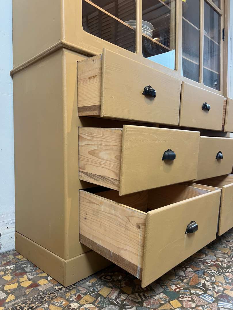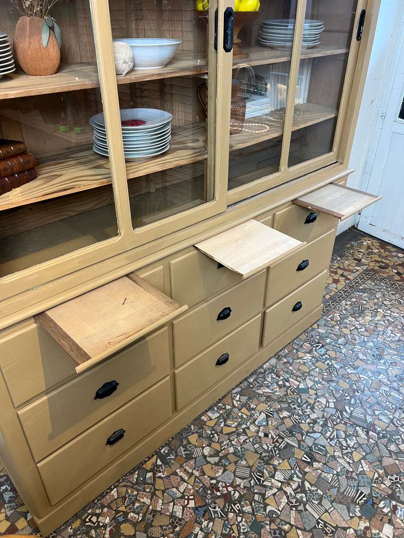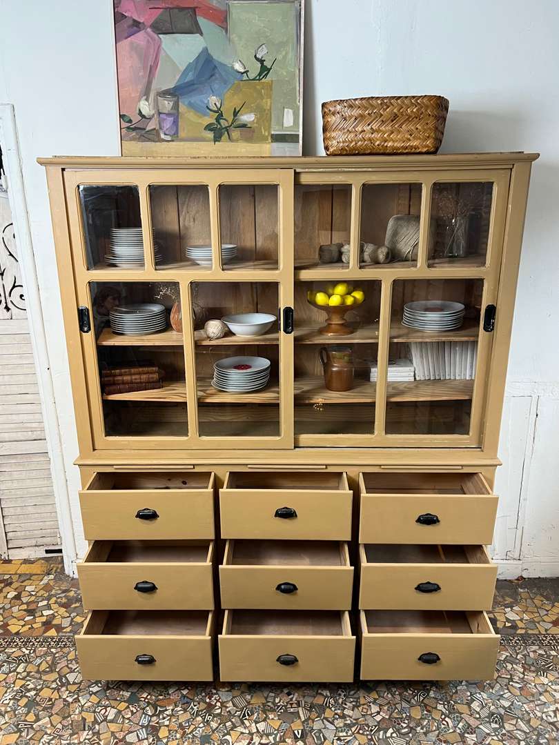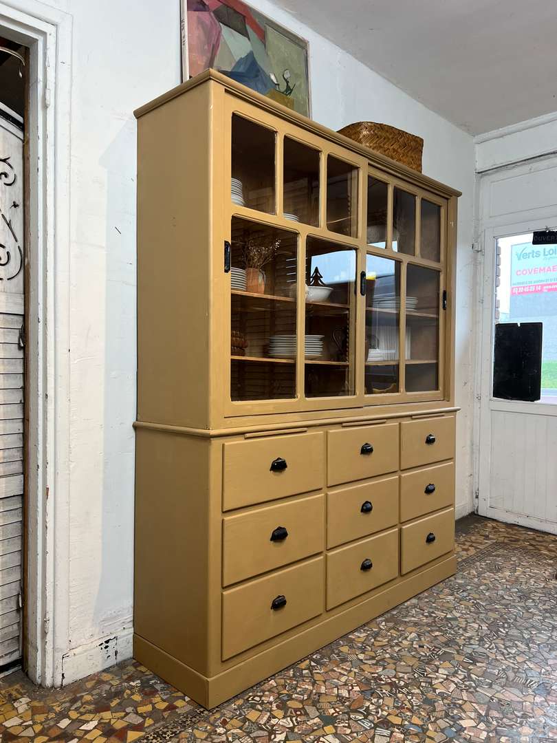 Charmant vaisselier en deux parties des années 50, entièrement repeint dans une jolie teinte ocre. Il offre une partie basse composée de tiroirs et trois petites tablettes coulissantes très pratiques, ainsi qu’une partie haute avec portes vitrées coulissantes et étagères pour exposer votre vaisselle. Un meuble fonctionnel et décoratif, parfait pour une cuisine ou une salle à manger.