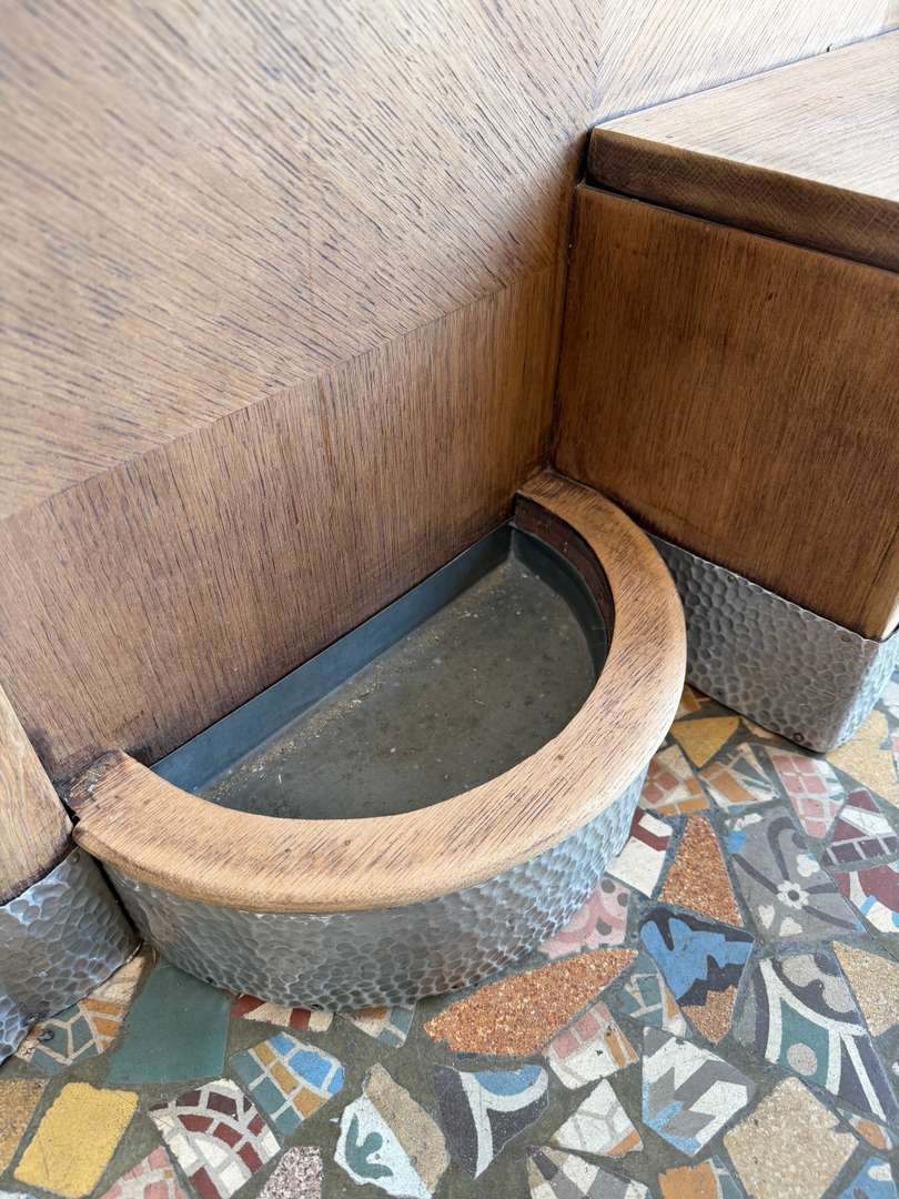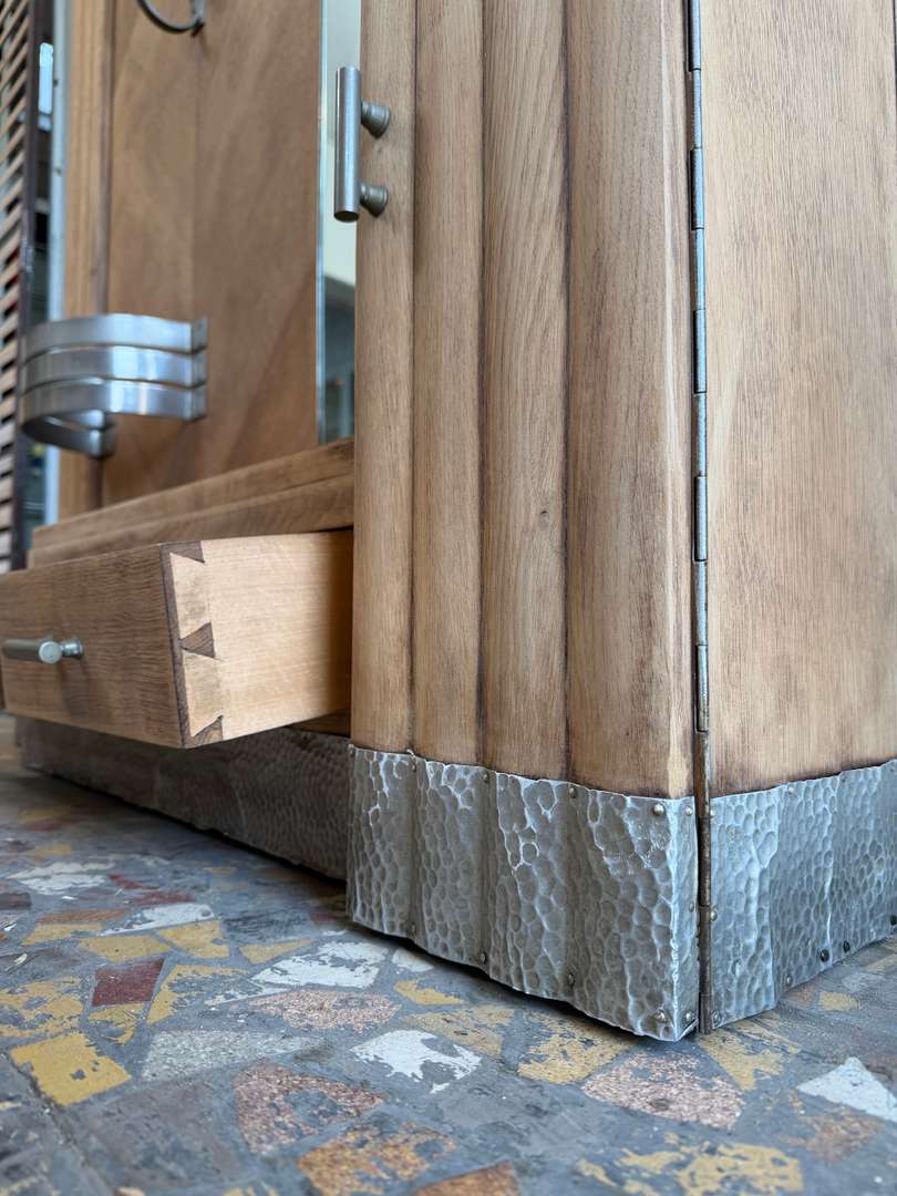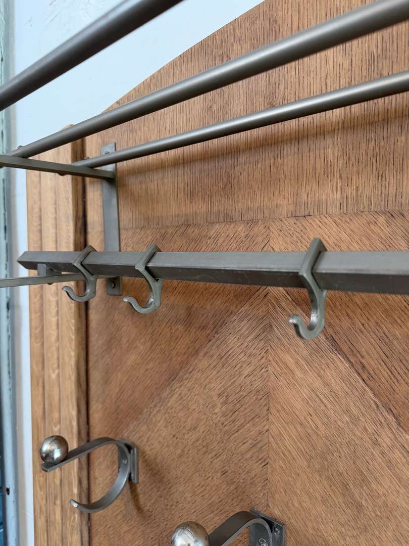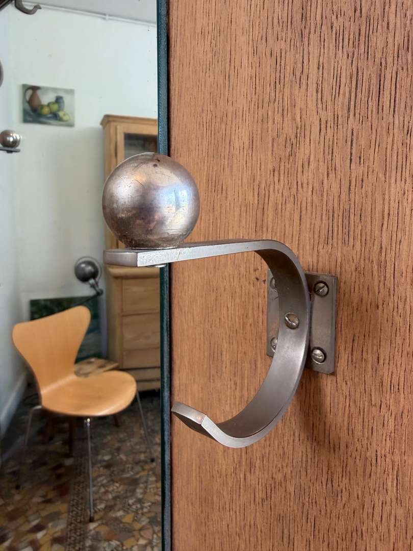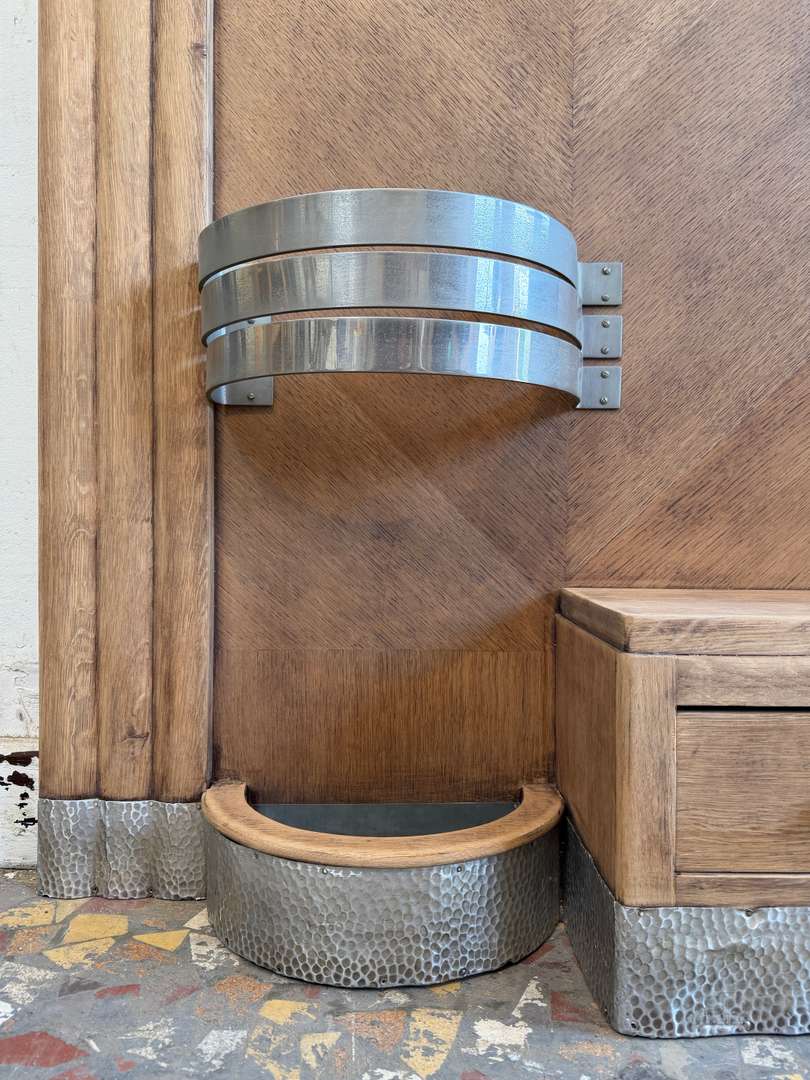 Il présente de beaux éléments en aluminium, dont certaines parties martelées, typiques de la période. Les tiroirs sont montés en queue d’aronde et offrent un rangement pratique. Présence également d’un porte-parapluie intégré.