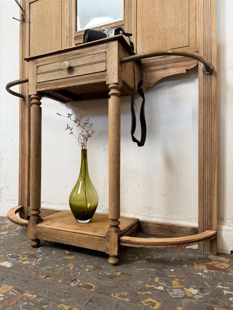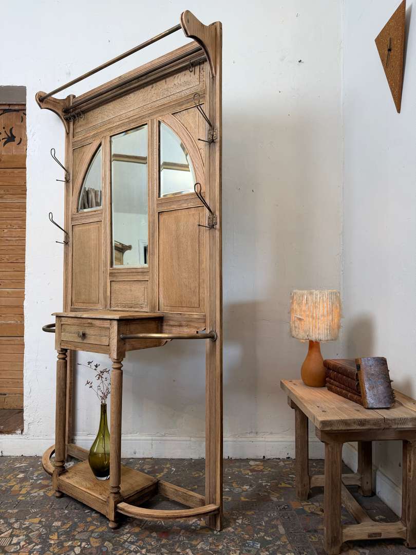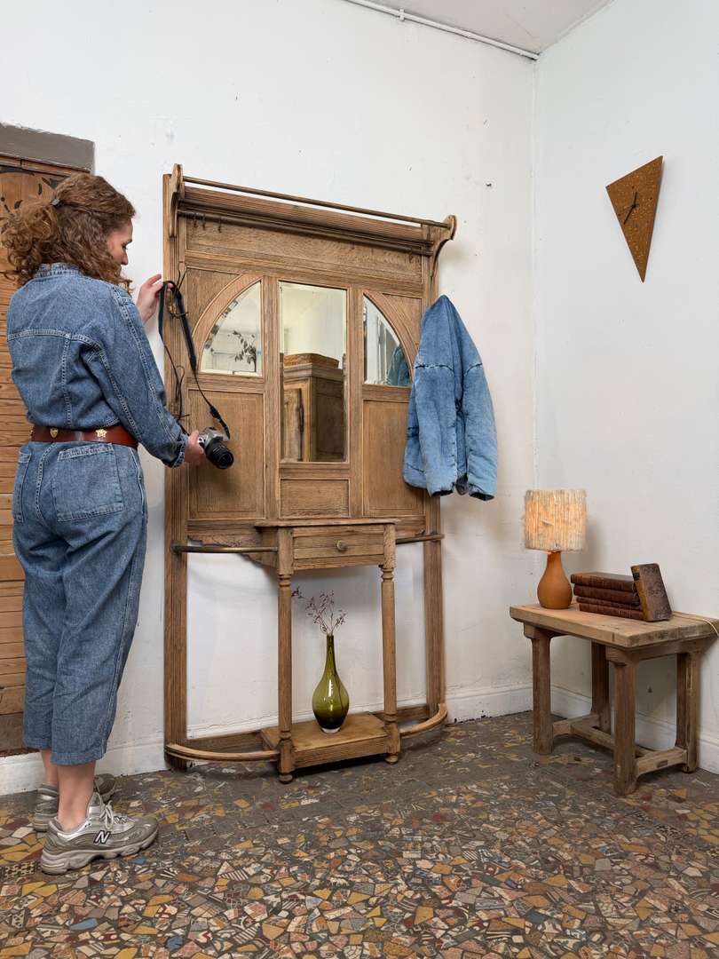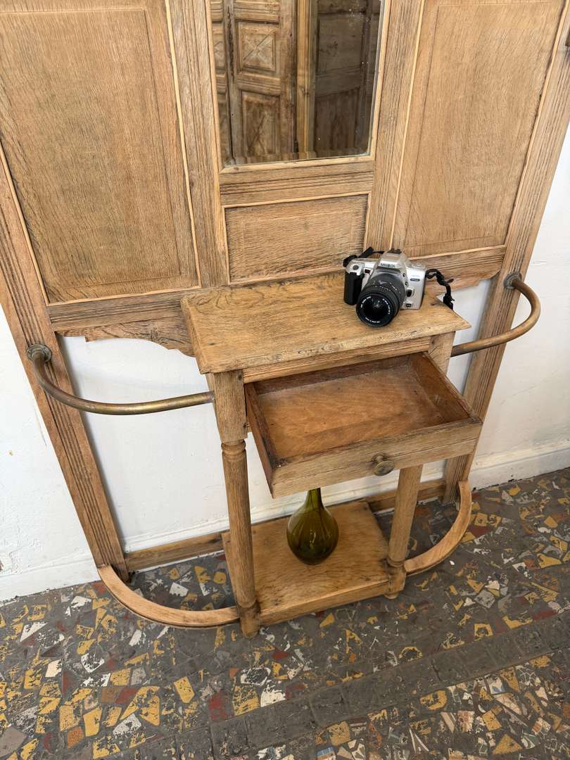 Vestiaire d’entrée en chêne — début XXe 550 € Ajouter au panierAncien vestiaire d’entrée en chêne datant du début du XXe siècle. Miroirs biseautés, barres en laiton et crochets d’origine. Il dispose de 4 patères et d’un petit tiroir central. #vestiaireancien #vestiaireentree #meubledentree #cheneancien #debut20emeDimensionsLargeur104 cmProfondeur27 cmHauteur193 cmRenseignementsRéférence2610004