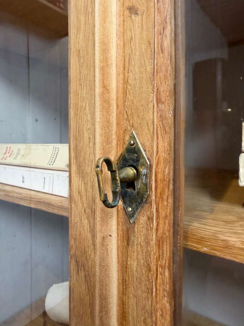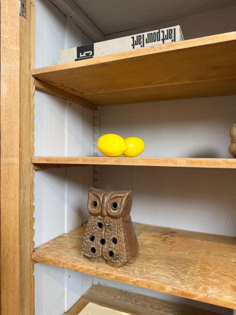 Étagères modulables en chêne également, permettant d’adapter le rangement selon vos envies. Fermeture à clé. Fond peint qui met en valeur les objets exposés.